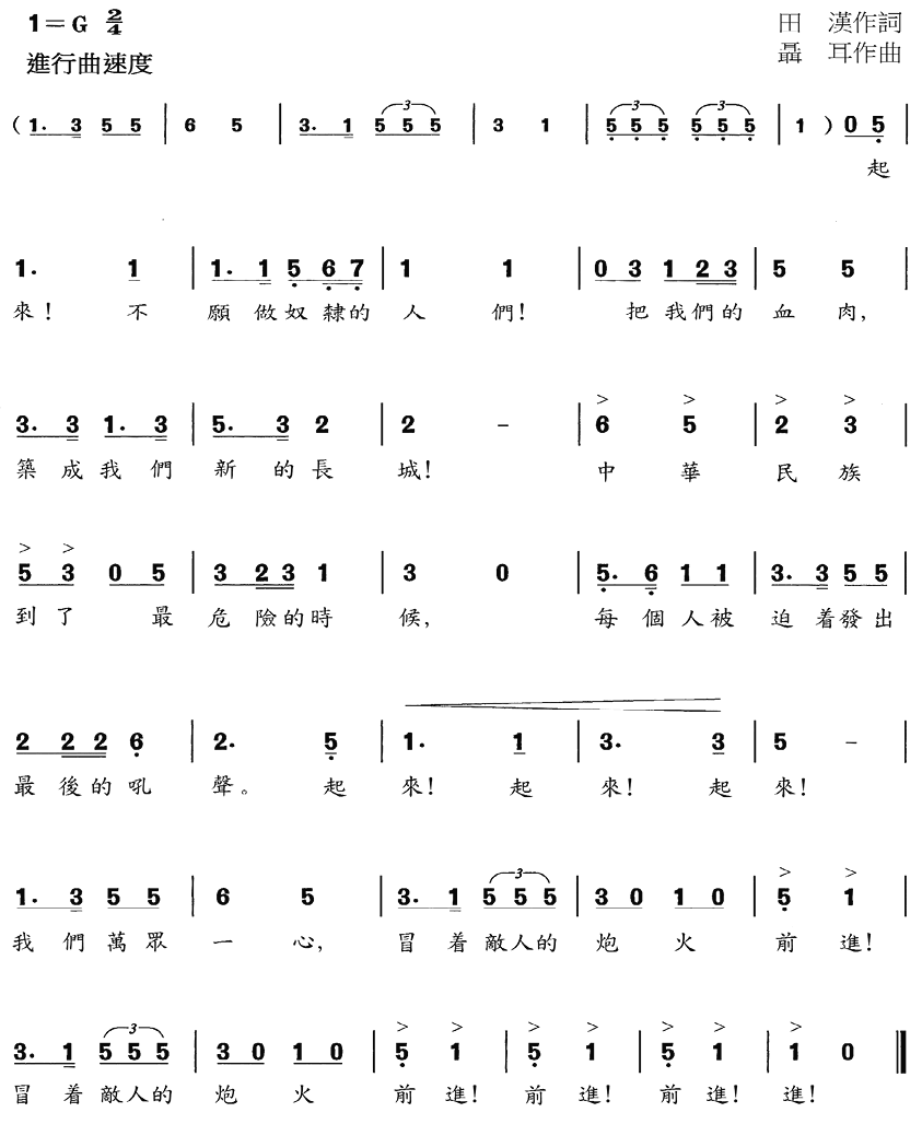 一、國歌應按照本法律附件四所載的歌詞和曲譜進行奏唱,不得採取有損國歌尊嚴的奏唱形式,尤其以歪曲、貶損方式奏唱國歌。