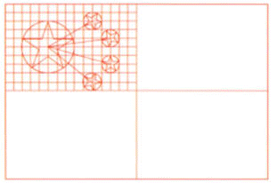 c) Relativamente aos pontos centrais das quatro estrelas pequenas de cinco pontas: o primeiro ponto corresponde ao ponto do rectângulo onde a segunda linha a partir de cima (ou a oitava a partir de baixo) e a décima linha a partir da esquerda (ou a quinta a partir da direita) se encontram; o segundo ponto corresponde ao ponto do rectângulo onde a quarta linha a partir de cima (ou a sexta a partir de baixo) e a décima segunda linha a partir da esquerda (ou a terceira a partir da direita) se encontram; o terceiro ponto corresponde ao ponto do rectângulo onde a sétima linha a partir de cima (ou a terceira a partir de baixo) e a décima segunda linha a partir da esquerda (ou a terceira a partir da direita) se encontram; o quarto ponto corresponde ao ponto do rectângulo onde a nona linha a partir de cima (ou a primeira a partir de baixo) e a décima linha a partir da esquerda (ou a quinta a partir da direita) se encontram. As quatro estrelas pequenas devem ser desenhadas da seguinte forma: a partir de cada um dos referidos pontos, desenha-se uma circunferência com um raio de comprimento igual a uma parte. Sobre cada uma das circunferências devem ser marcados cinco pontos equidistantes. Um destes pontos deve encontrar-se sobre a linha que liga o ponto central da estrela grande e o das estrelas pequenas. Seguidamente, formam-se as quatro estrelas pequenas da forma indicada para a formação da estrela grande. Cada uma das estrelas pequenas deve ter uma ponta orientada para o ponto central da estrela grande.