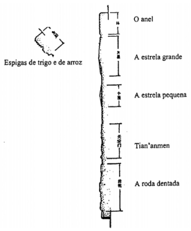 Artigo 2.º O Emblema Nacional da República Popular da China tem ao centro um desenho de Tian’anmen iluminada por cinco estrelas, rodeado por espigas e uma roda dentada.