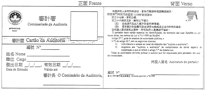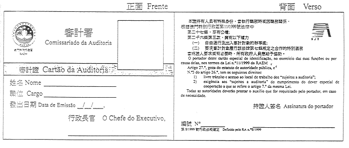 三、證件預先印有中文及葡文,並應填寫權利人的姓名及以中、葡文寫上所擔任的職務。
