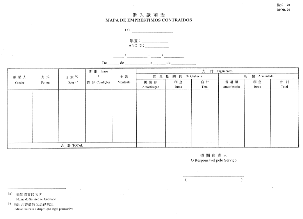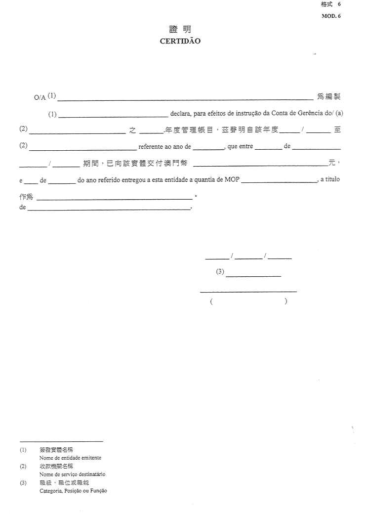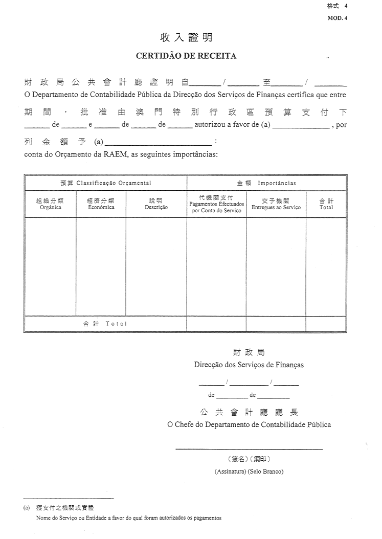 1)由財政局公共會計廳發出,用以顯示已收取登錄在澳門特別行政區總預算之撥款之證明-格式4;