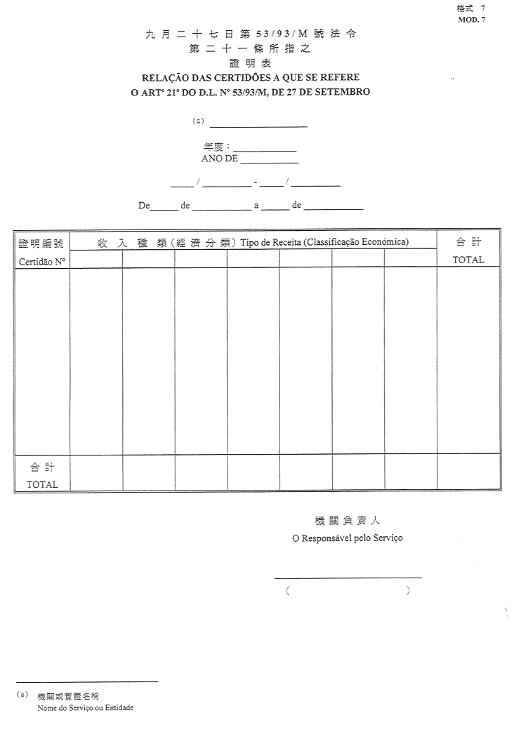4)徵收九月二十七日第53/93/M號法令第二十一條所指之本身收入證明表-格式7;