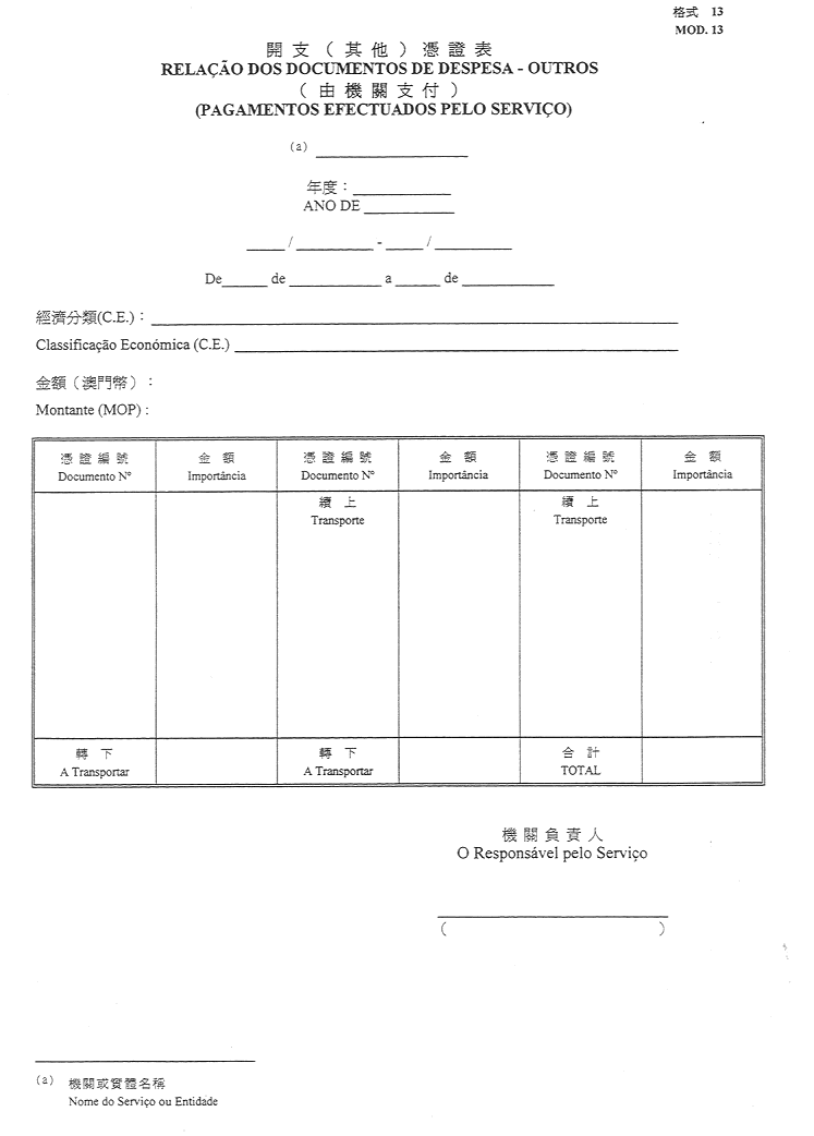 4)由機關或實體本身支付而不屬上述1)及2)所指開支之憑證表-格式13;