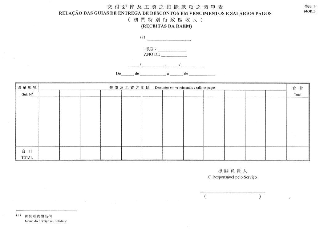 6)澳門特別行政區收入(從機關直接支付之薪俸及工資所作之扣除)交付憑單表-格式14;