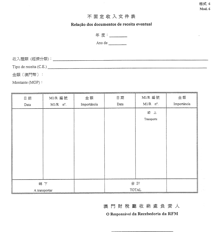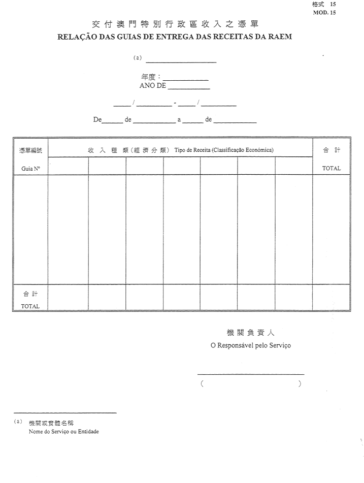 6)澳門特別行政區收入(由機關或實體所徵收-澳門特別行政區預算、其他)交付憑單表-格式15;