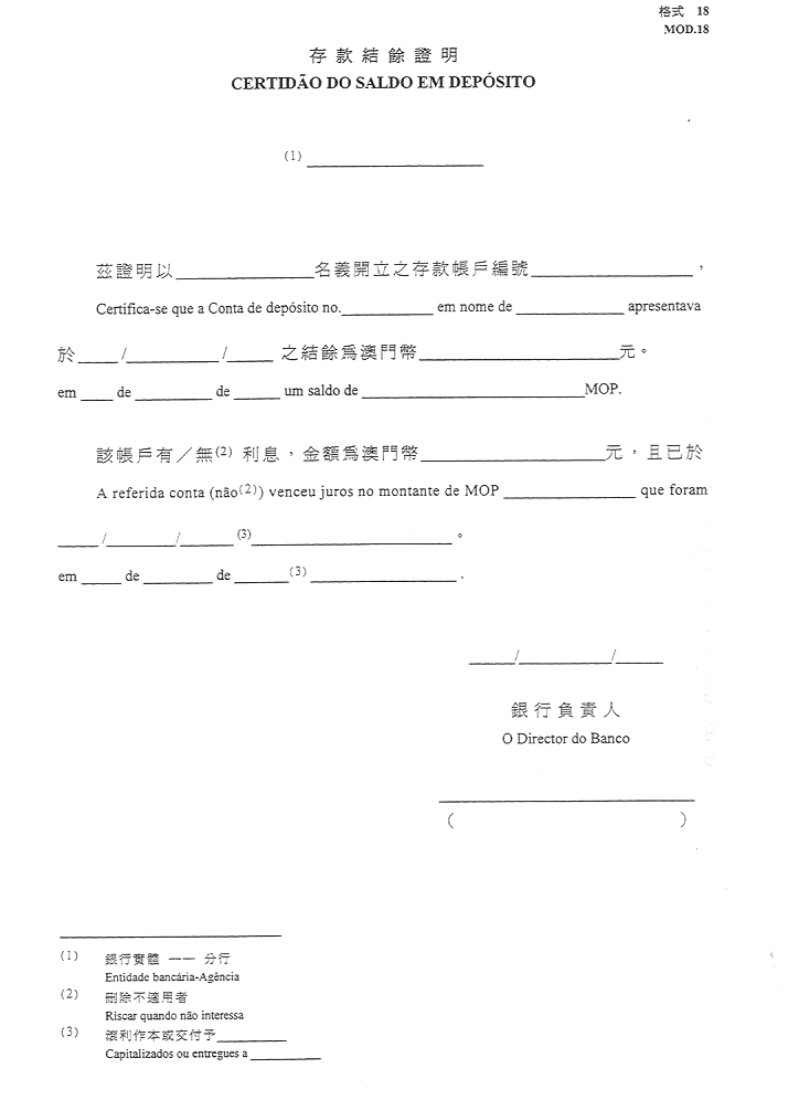 10)由銀行實體發出,用以顯示在十二月三十一日或管理期間最後一日之結餘之證明(但後者僅適用於管理期間與經濟年度不一致之情況),其中應指出有否報酬性利息。如有利息,則必須指出其金額、支付日期,以及說明將利息記入有關帳戶之貸方或交予其他實體-格式18;