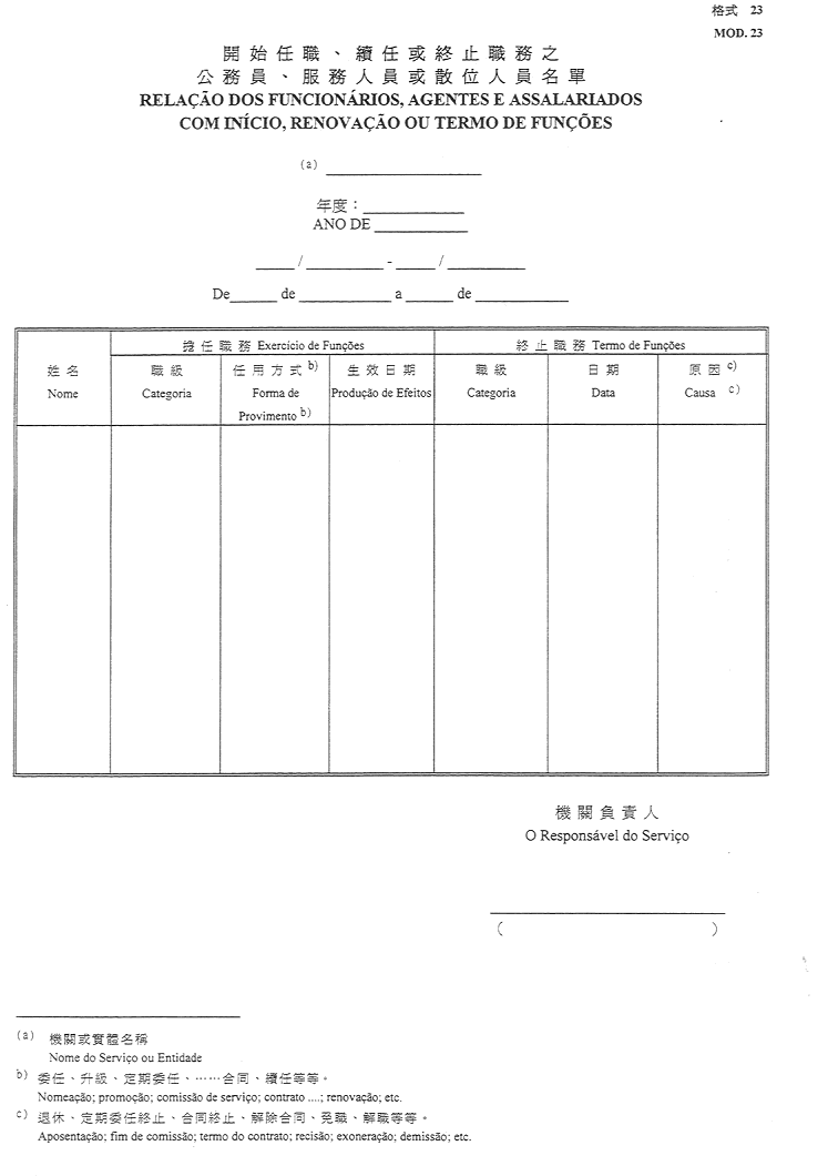 11)於管理期間開始任職、續任或終止職務之公務員、服務人員及散位人員之名單-格式23;