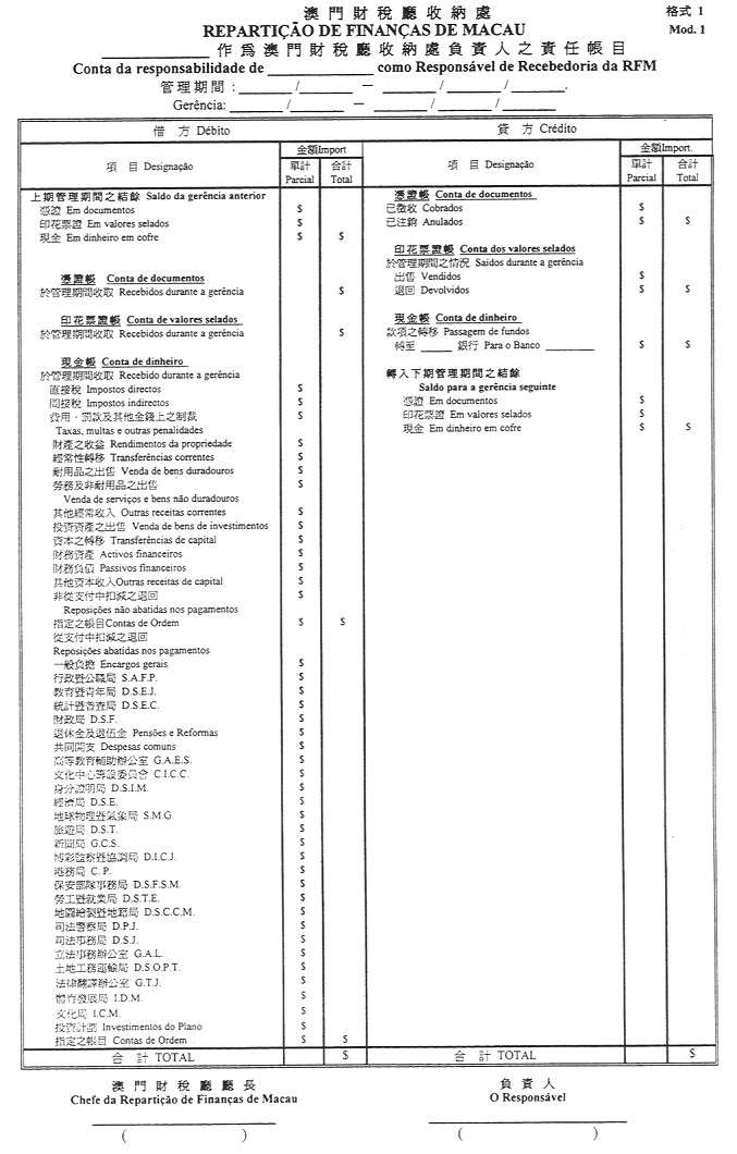 1)收納員帳目應由收納員根據存放於收納處之會計資料及紀錄編製,並應由澳門財稅廳廳長簽名及加蓋鋼印證明。