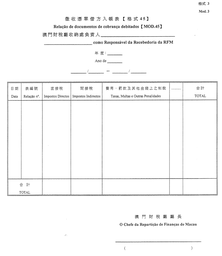 -交付予收納員之徵收憑證表【RGAF之格式45】(1),該表由財稅廳編製,並經廳長簽名及加蓋該廳鋼印認證-格式3。