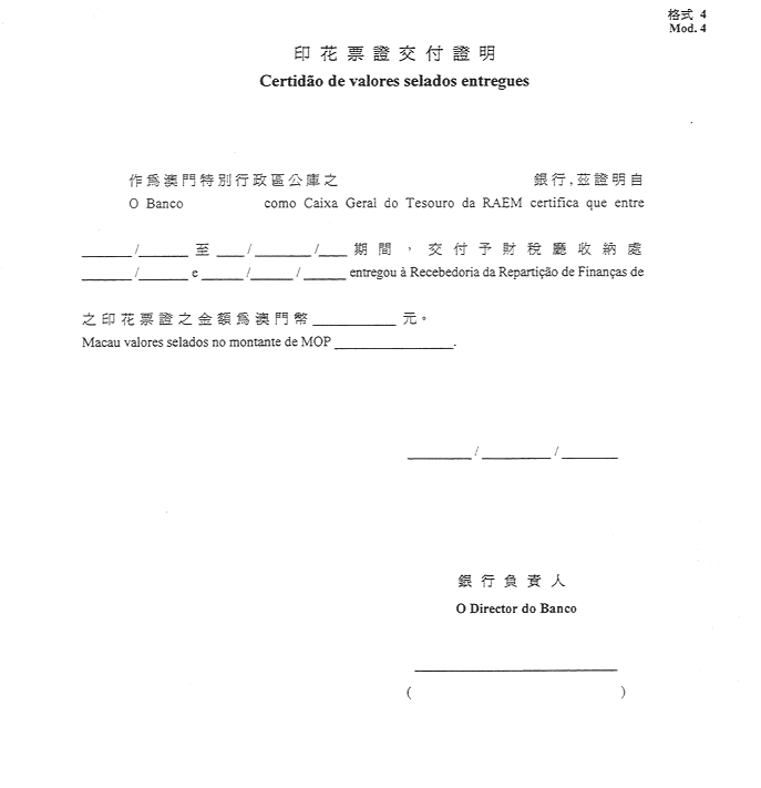 -由銀行發出,用以證明在管理期間交付予收納員之印花票證之金額之憑證-格式4。