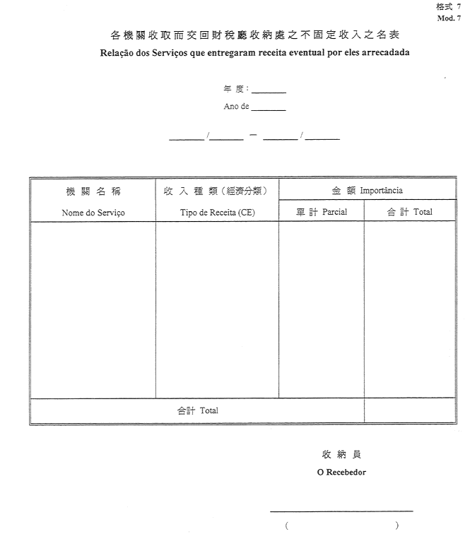c)於管理期間內,把所徵收之不固定收入交付予收納處之實體或機關之名表-格式7;