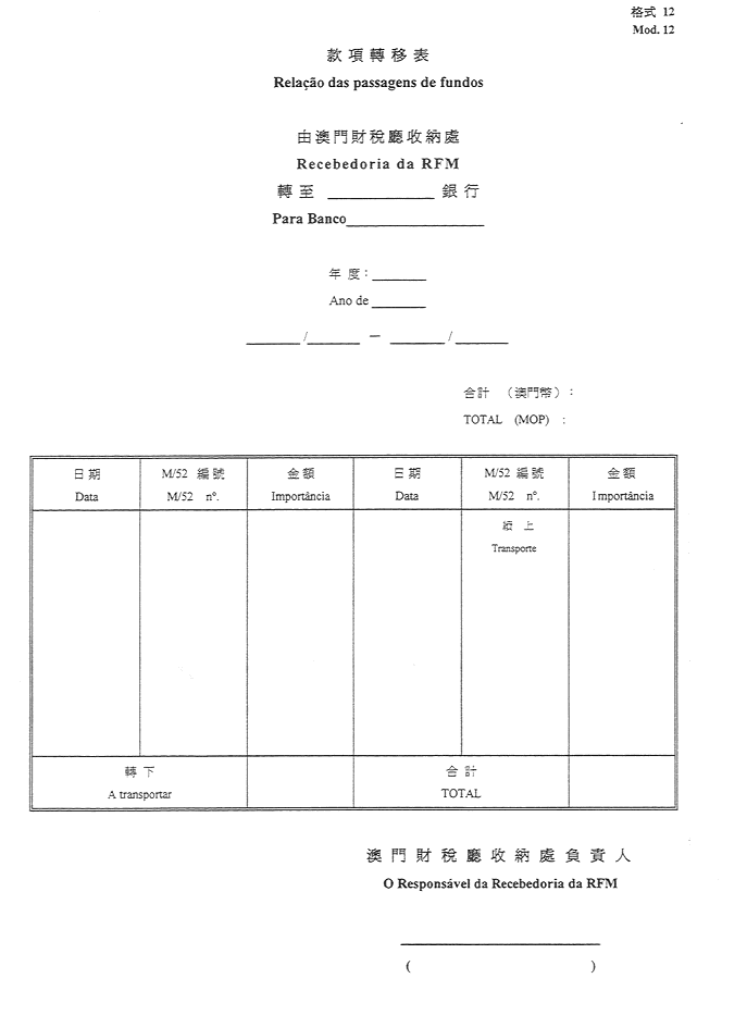-於管理期間內,將款項轉移至作為公庫的銀行之收據表【RGAF之格式52】(1)-格式12。