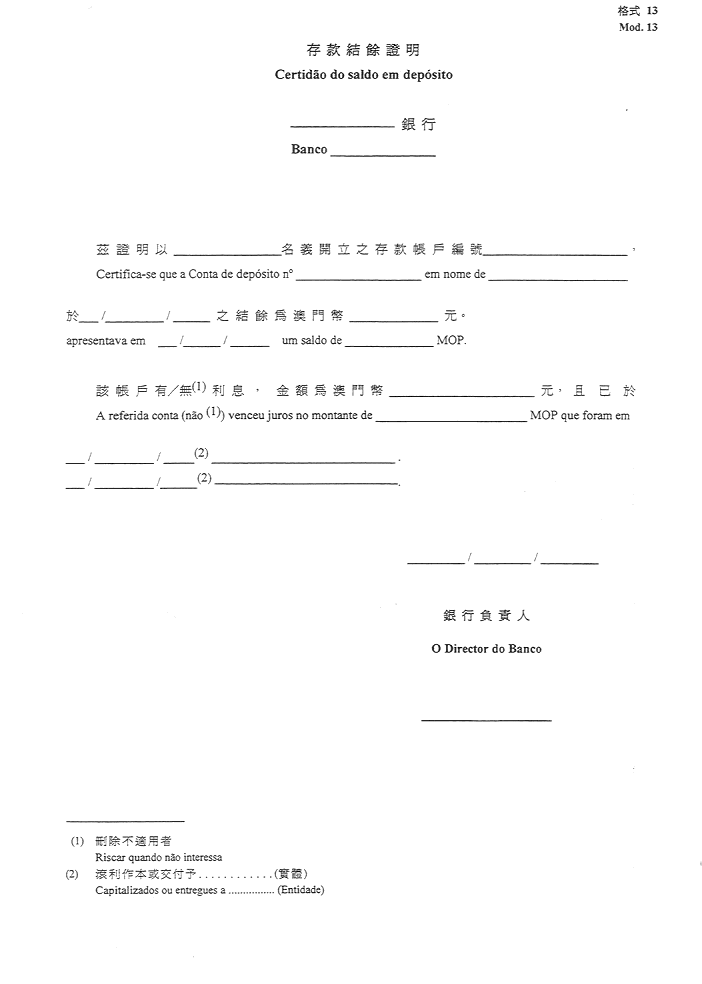 a)由銀行實體發出,用以證明截至十二月三十一日或管理期間最後一日之結餘之文件(但後者僅適用於管理期間與經濟年度不一致之情況),其中應指出有否報酬性利息。如有利息,則必須指出其金額、支付日期,以及說明將利息記入有關帳目之貸方或交付予其他實體-格式13;