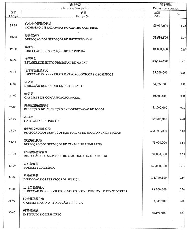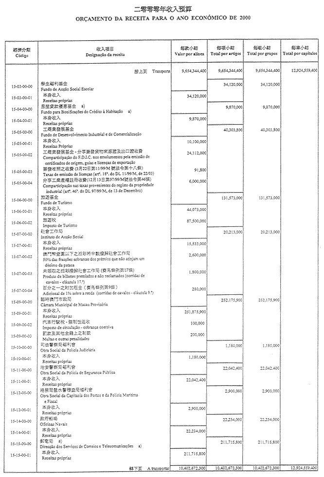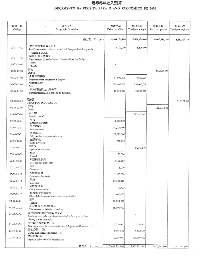 通過作為本法組成部份之二零零零財政年度澳門特別行政區財政預算(OR/2000),並由二零零零年一月一日起開始生效及執行。