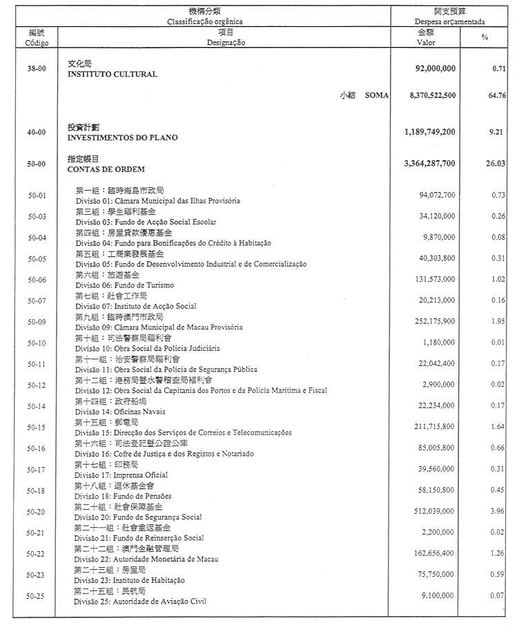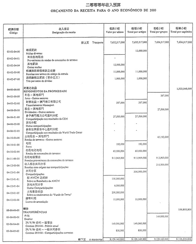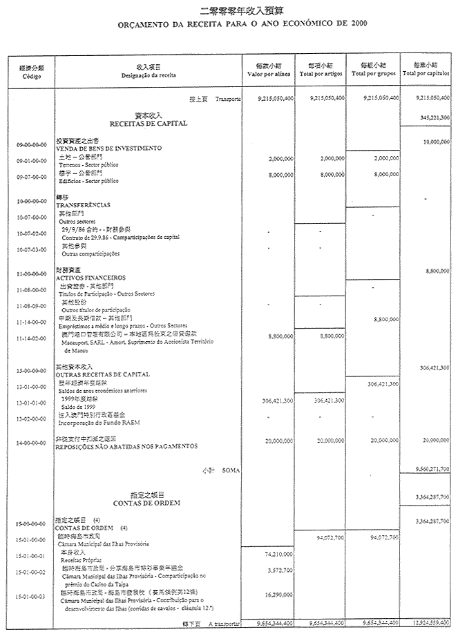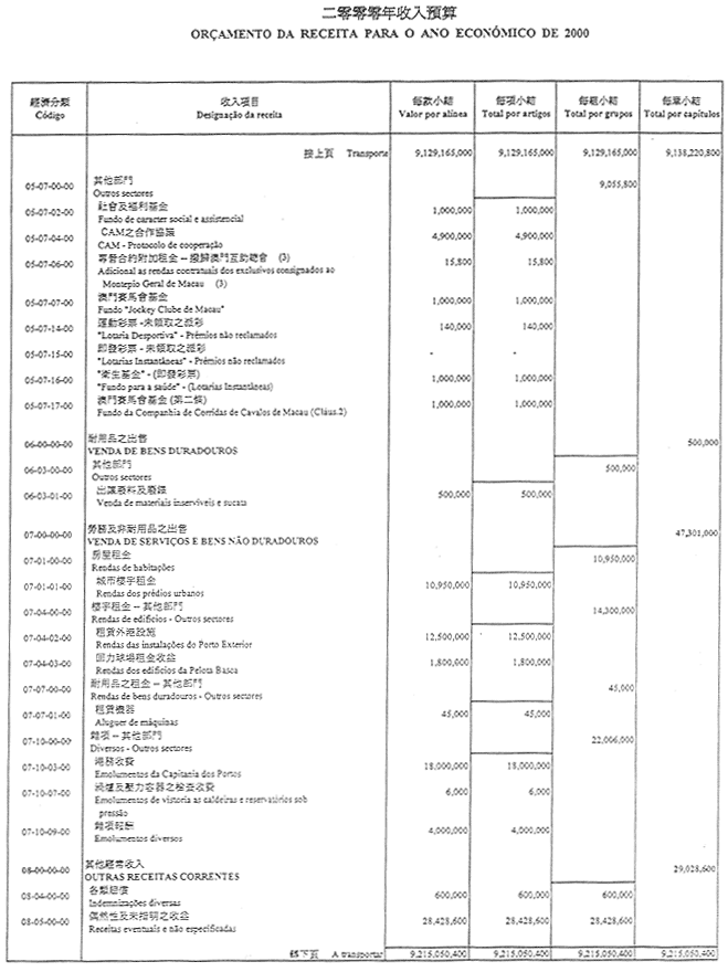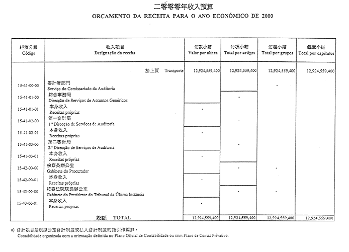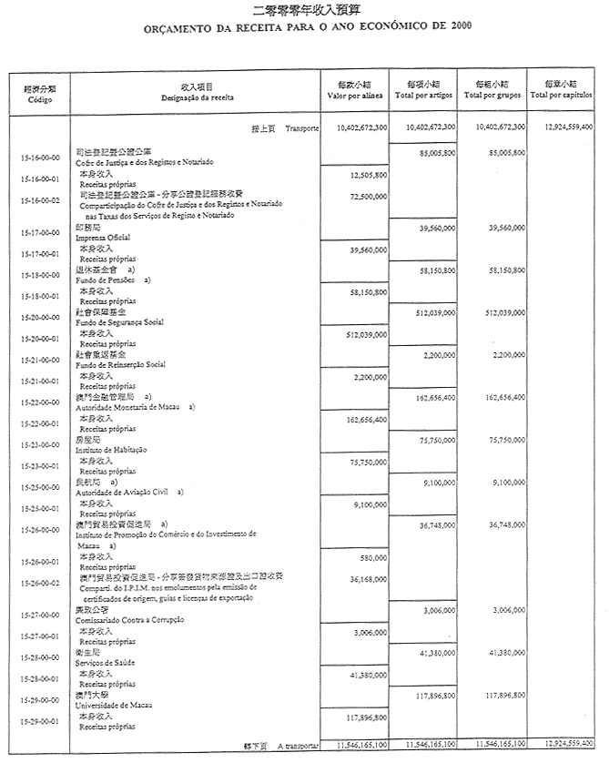 一、二零零零年澳門特別行政區財政預算係按照關於財政預算及公共帳目之法規而編製,並已顧及各自治實體及各臨時市政局財政制度之專有情況。