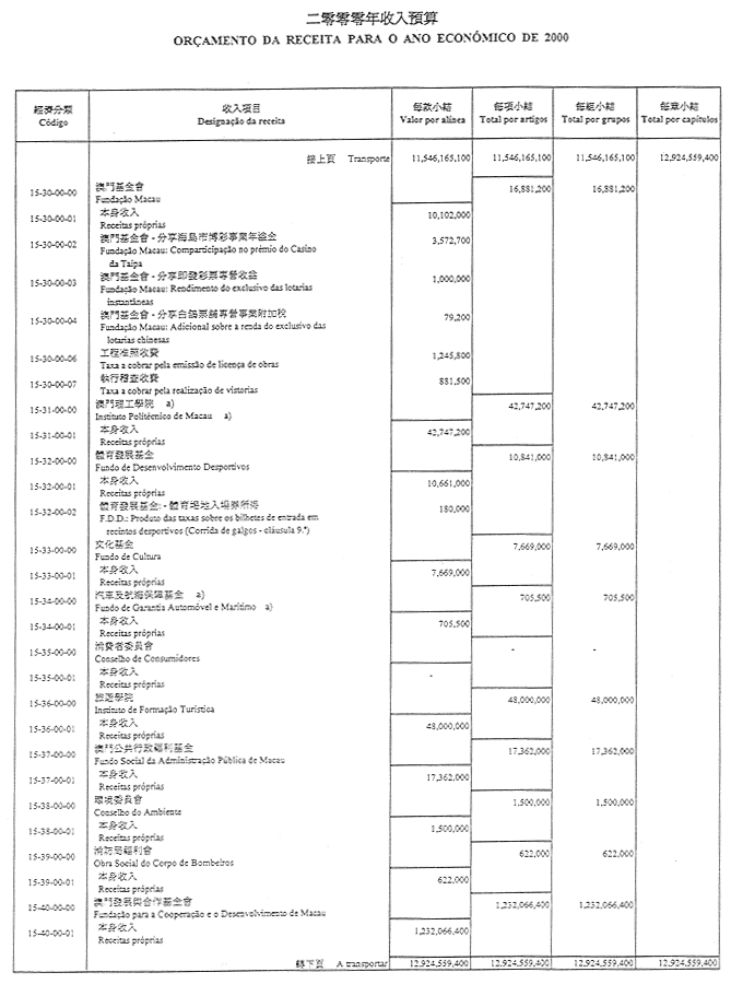 一、稅捐、直接與間接稅及其他收入之總所得預計為澳門幣12,924,559,400.00圓,並於二零零零年內按照現規範或將規範有關徵收之法律規定進行徵收;該總所得應根據現行法規之規定,用於支付二零零零年內所作之開支。