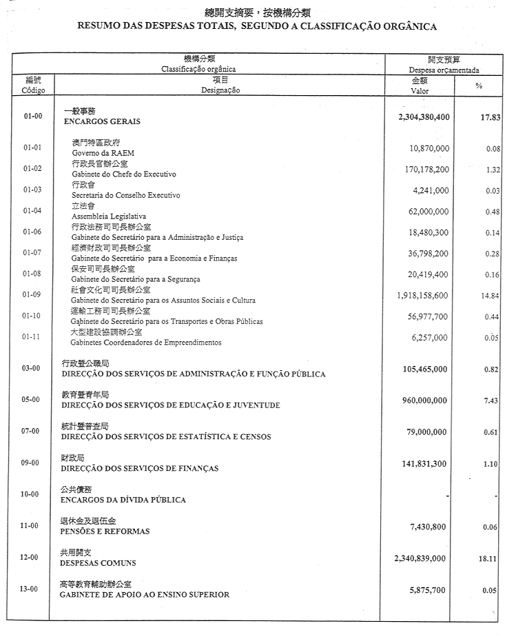 二零零零財政年度之財政預算開支總額定為澳門幣12,924,559,400.00圓。
