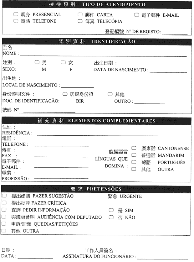 二、在接待市民時,由負責接待的工作人員按屬本決議組成部分的附件所載格式填寫接待登記表,且載明有關人士的下列資料: