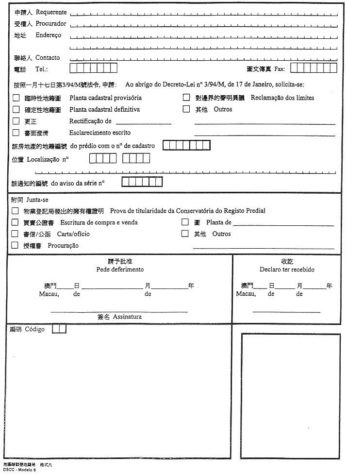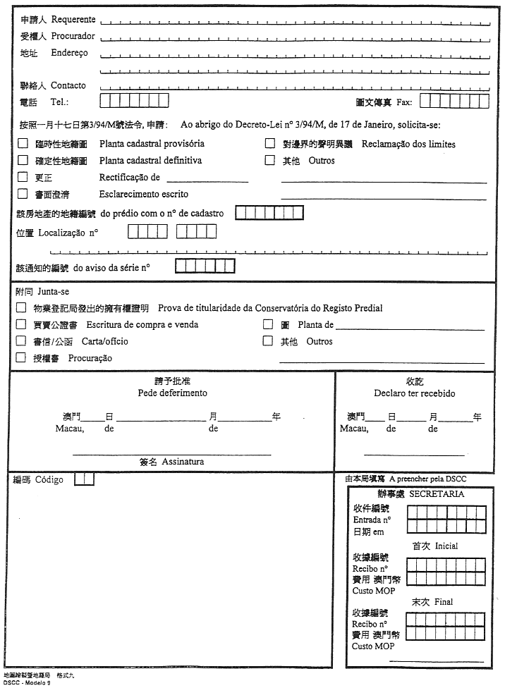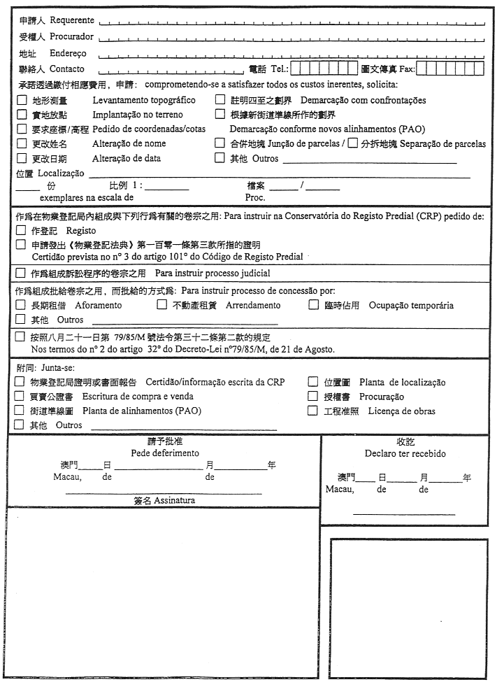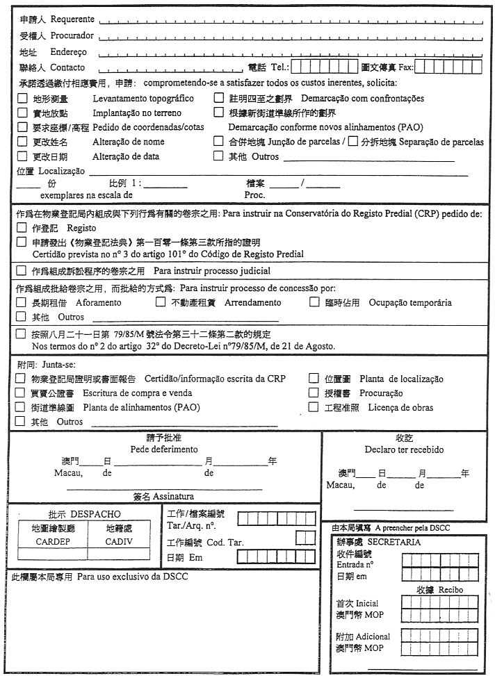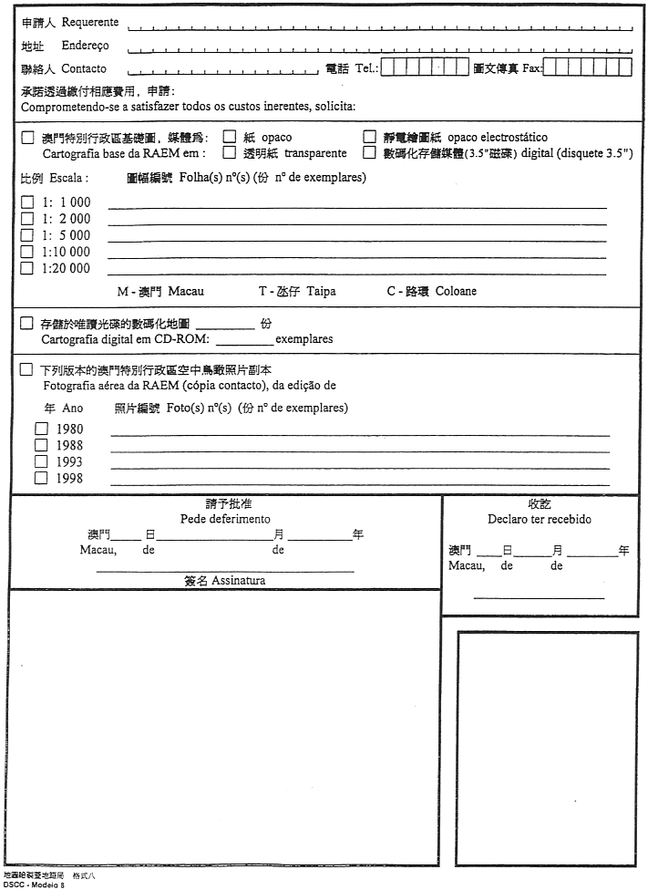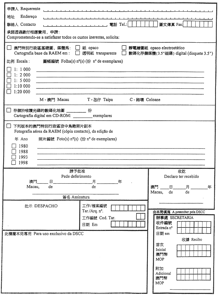 一、五月二十日第113/96/M號訓令第五條第一款核准的請求地圖繪製暨地籍局提供服務的申請表式樣,由載於本批示附件內的式樣取替,該附件為本批示的組成部分。