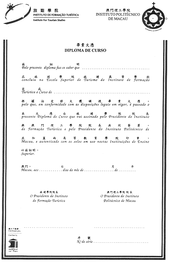 三、上述證書由旅遊學院院長和澳門理工學院院長簽署並須蓋有兩院現行使用的鋼印加以確認。