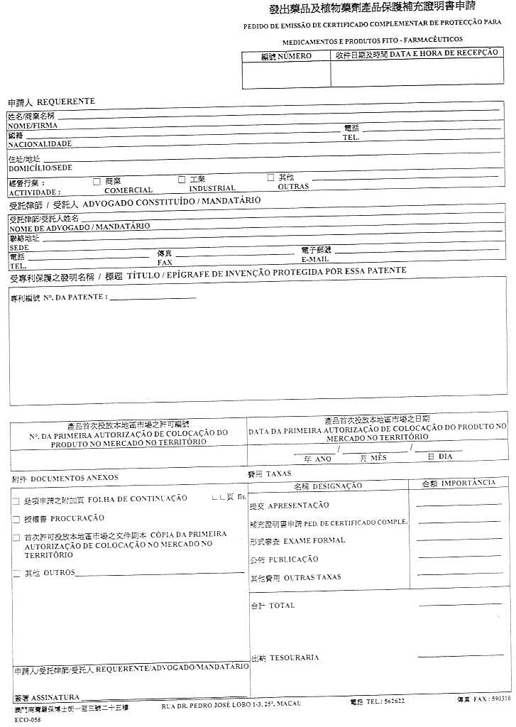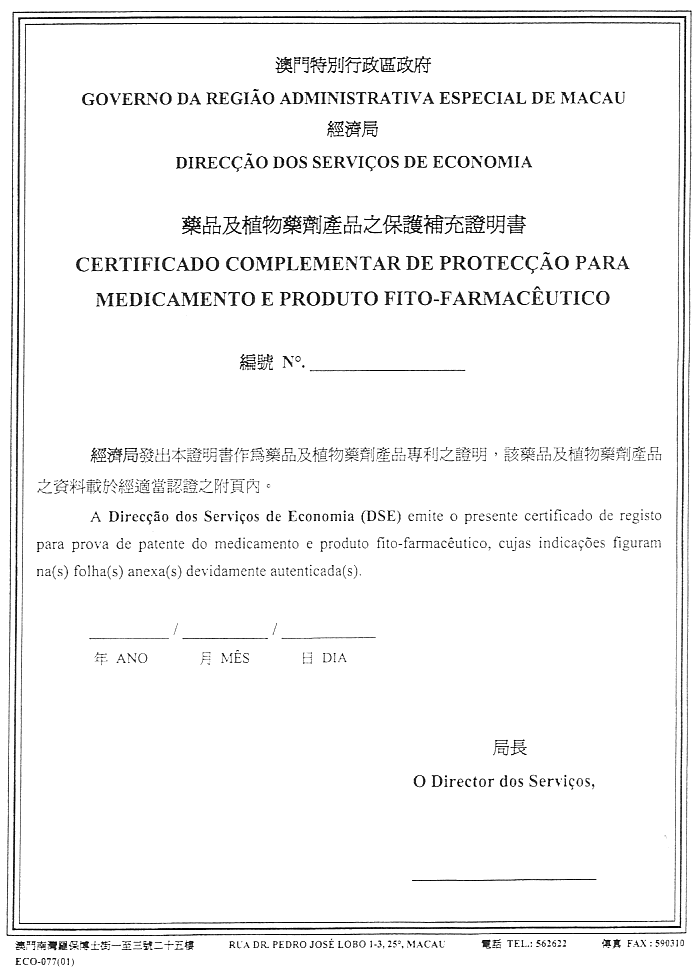 原文為:“…Pedido de Emissão de Certificado Complementar de Protecção para Medicamentos e Produtos Fito-Farmarcêuticos…”