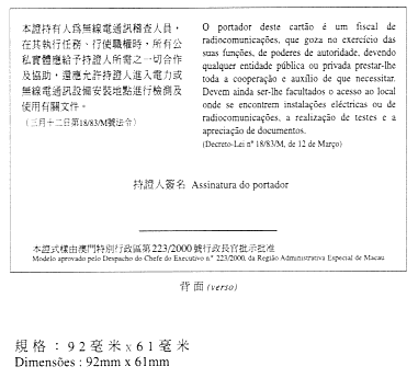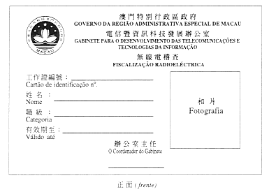 二、工作證為白色,尺寸為92毫米x 61毫米,印有“澳門特別行政區政府”、“電信暨資訊科技發展辦公室”和“無線電稽查”之中葡文字樣。