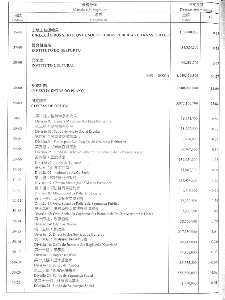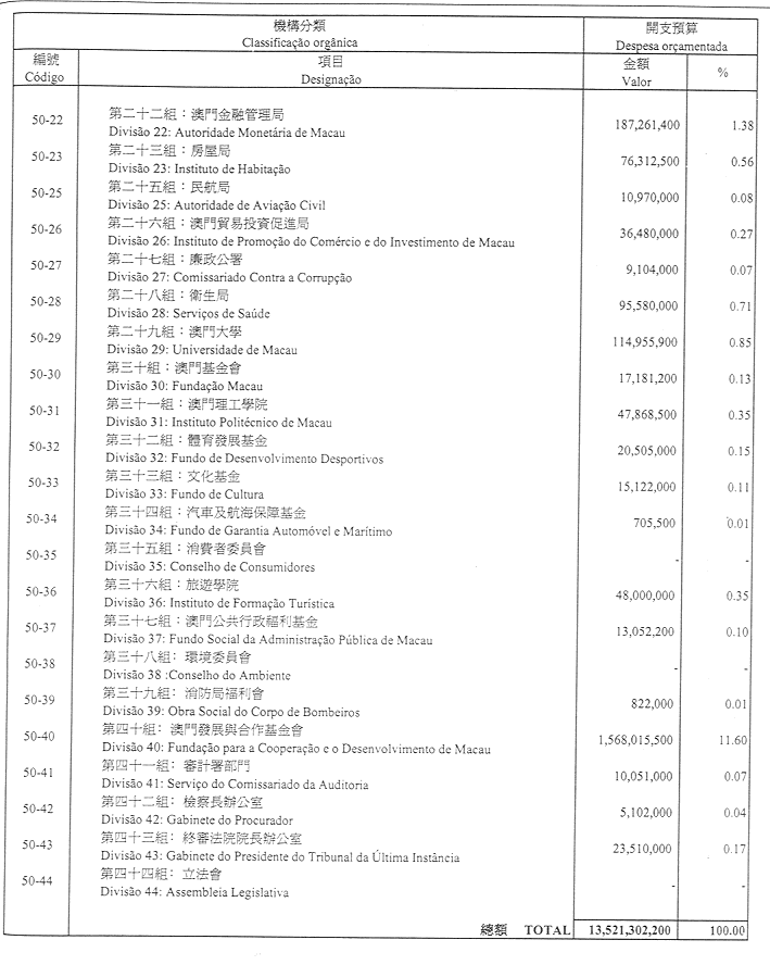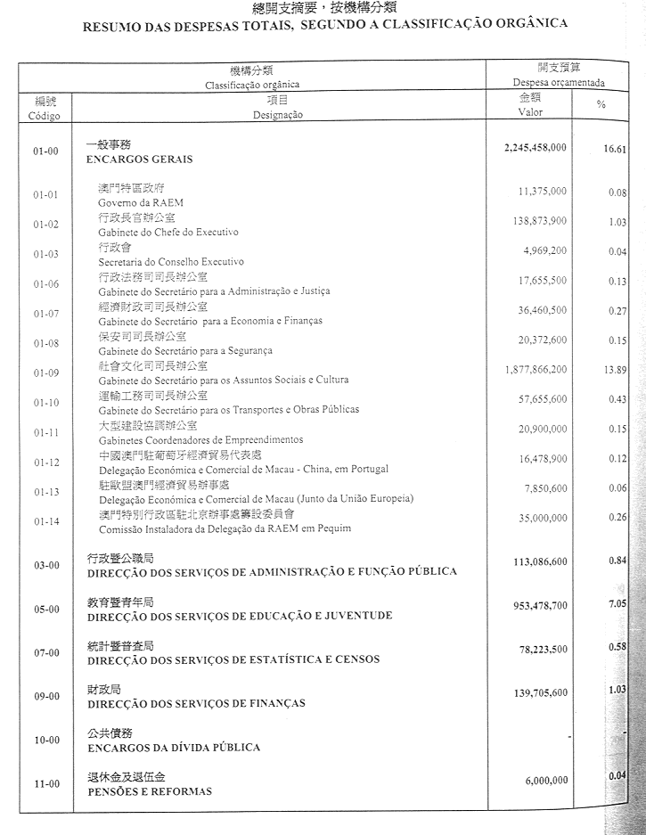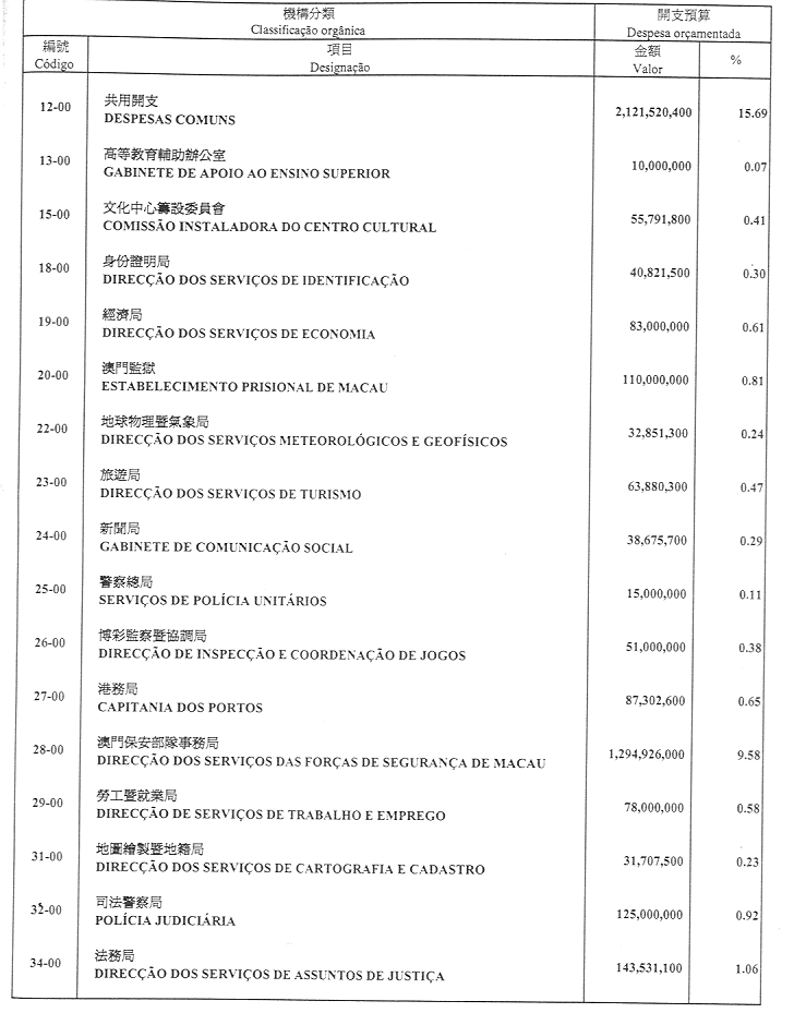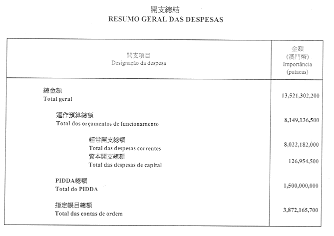 二零零一財政年度之財政預算開支總額定為澳門幣13,521,302,200.00圓。