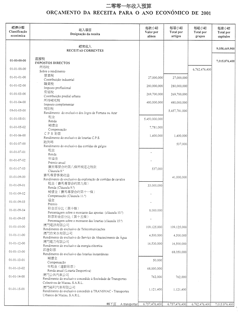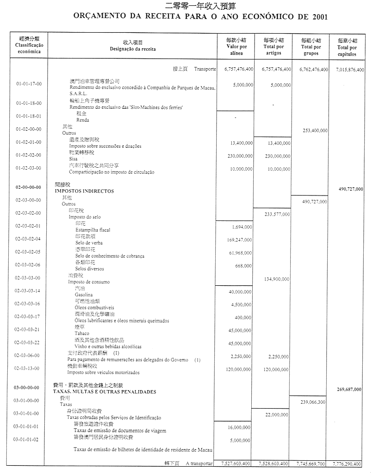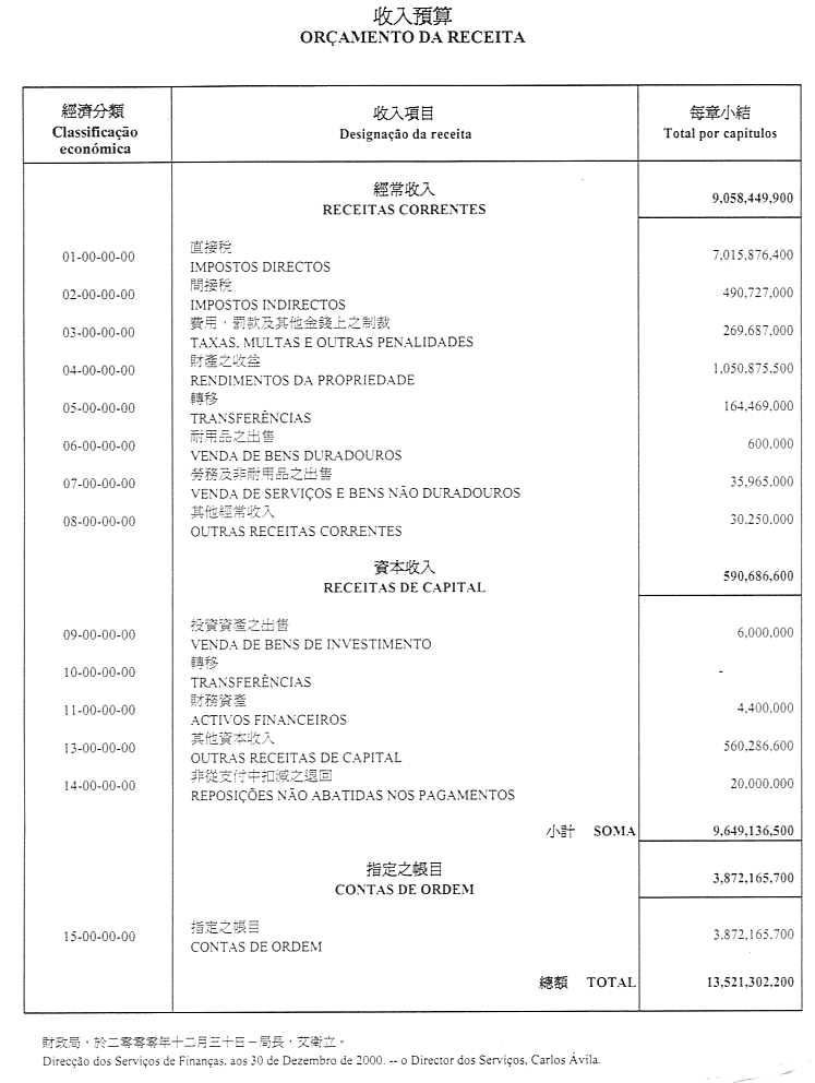 一、稅捐、直接與間接稅及其他收入之總所得預計為澳門幣13,521,302,200.00圓,並於二零零一年內按照現規範或將規範有關徵收之法律規定進行徵收;該總所得應根據現行法規之規定,用於支付二零零一年內所作之開支。
