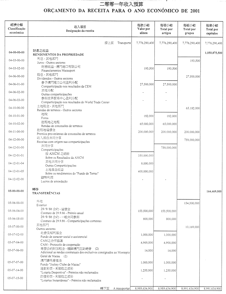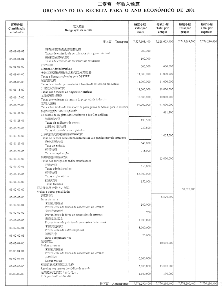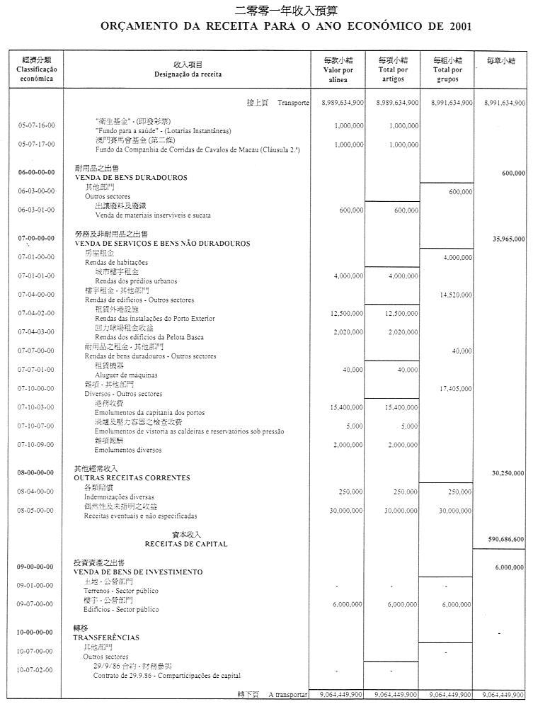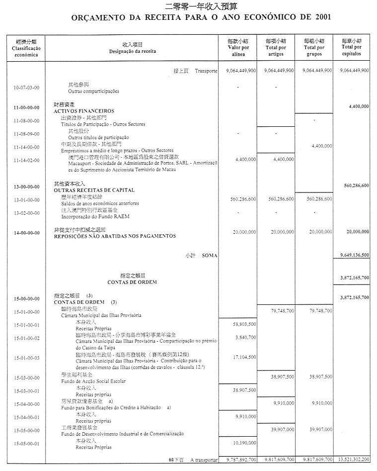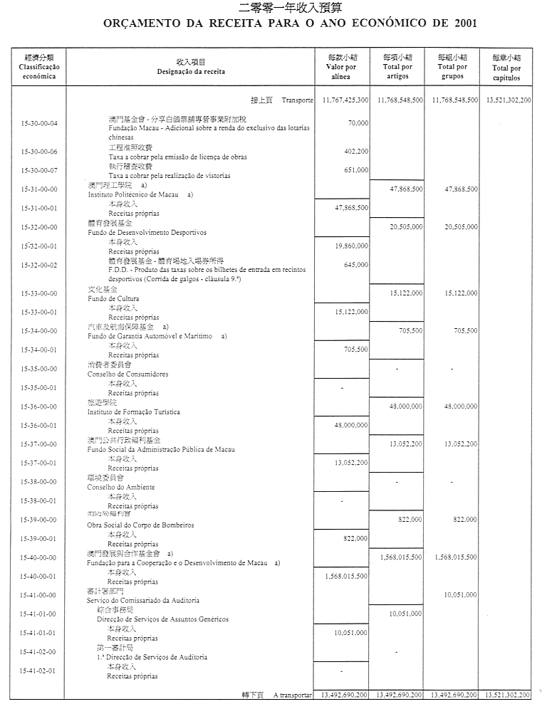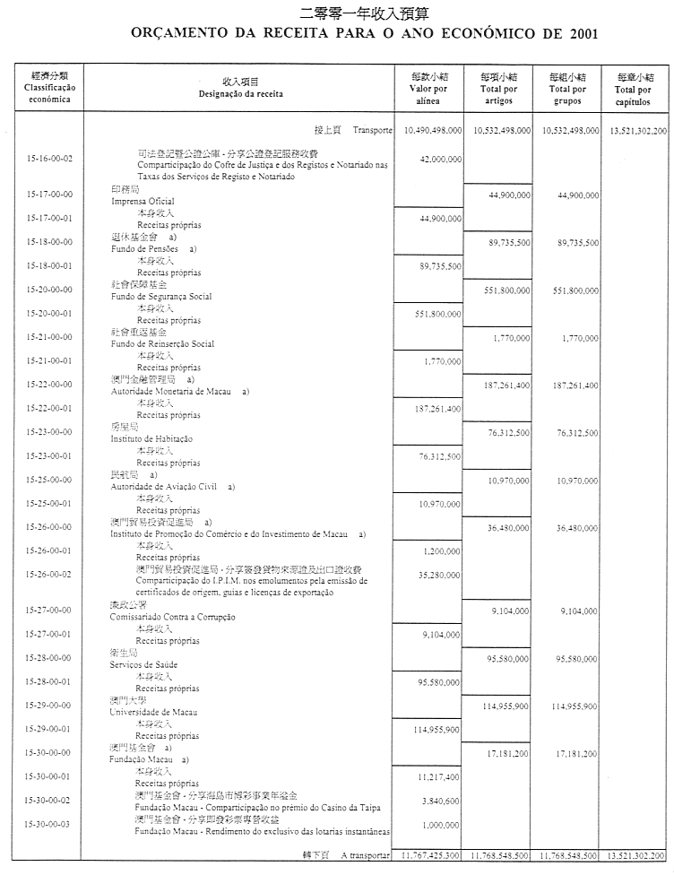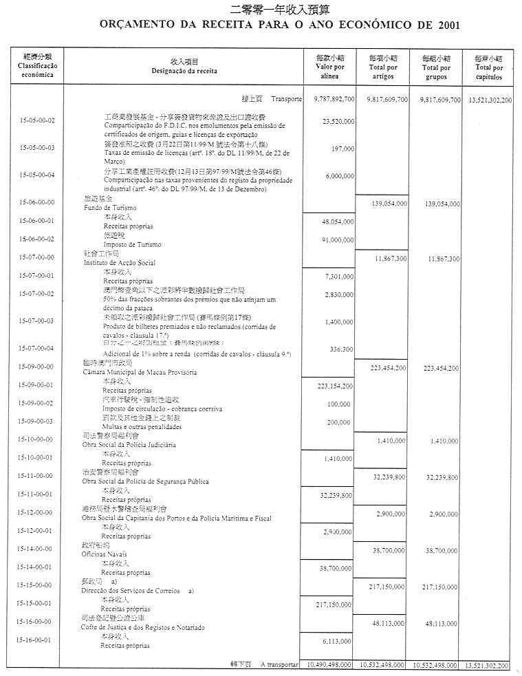 通過作為本法組成部份之二零零一財政年度澳門特別行政區財政預算(OR/2001),並由二零零一年一月一日起開始生效及執行。