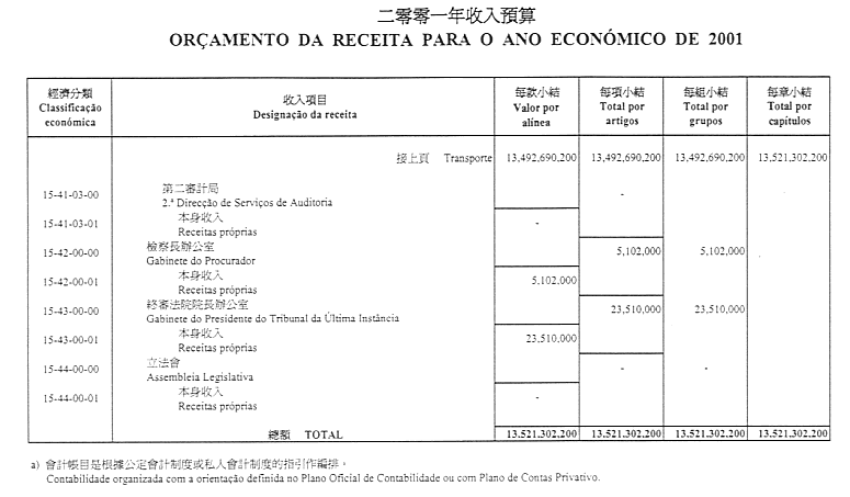 一、二零零一年澳門特別行政區財政預算係按照關於財政預算及公共帳目之法規而編製,並已顧及各自治實體及各臨時市政局財政制度之專有情況。