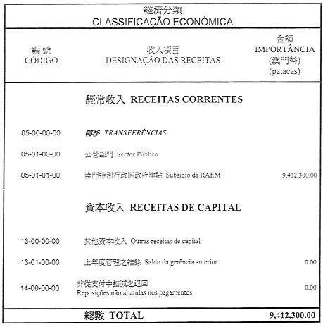 核准環境委員會二零零一年財政年度之本身預算,並於二零零一年一月一日起開始執行,預計收入及開支之金額均為澳門幣9,412,300.00(玖佰肆拾壹萬貳仟叁佰元整),該預算為本批示之組成部份。