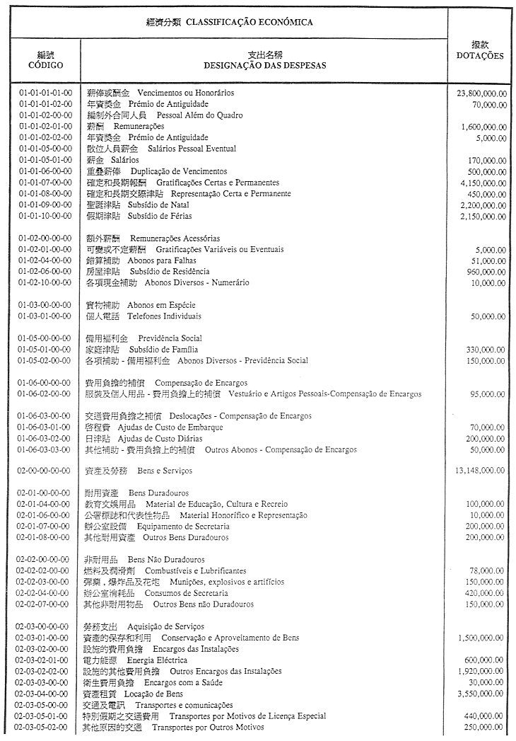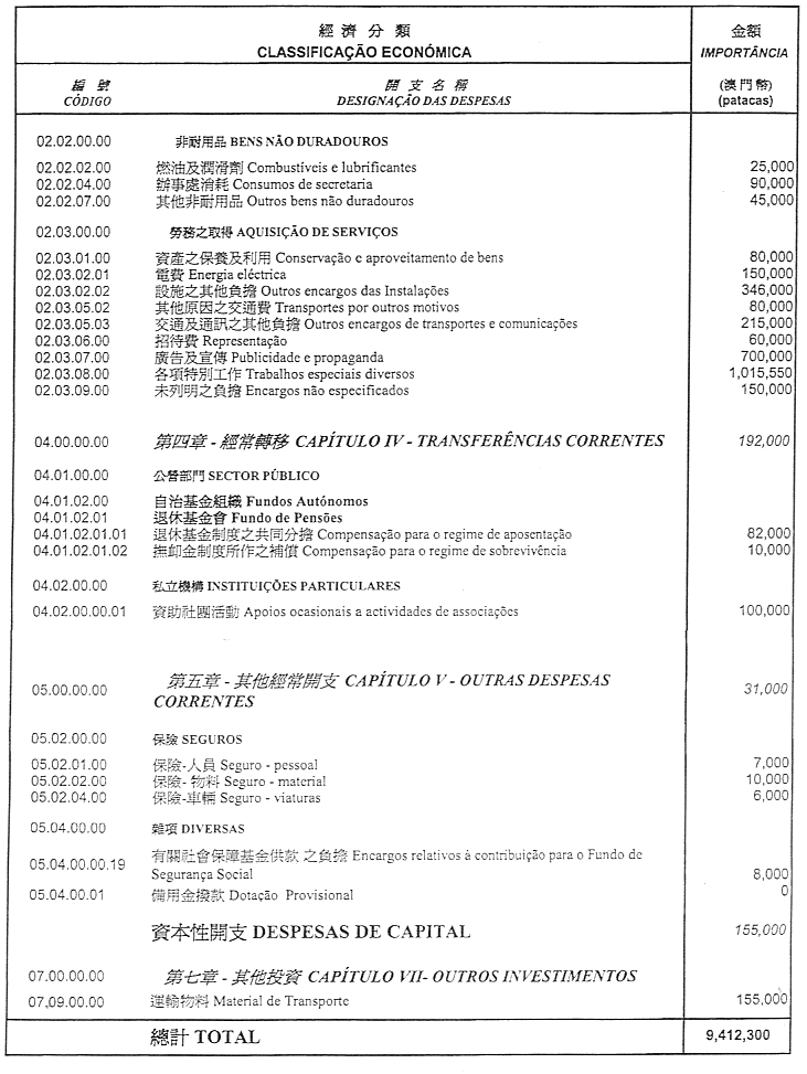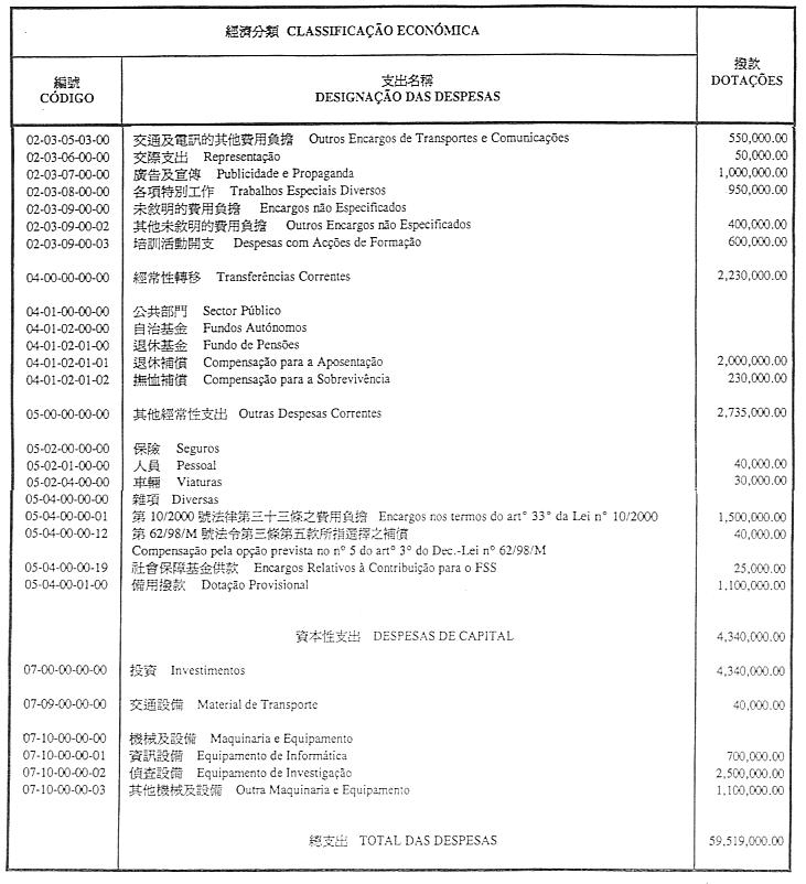 二、二零零零年的負擔將會由登錄於本年度澳門特別行政區財政預算第一章第二組「經常開支」中職能分類9-03-0經濟分類04-04-00-00-06項目為“經常轉移-外地-澳門特別行政區駐北京辦事處籌設委員會”中的分項目02-03-02-02“設施之其他負擔”及02-03-04-00“資產租賃”之撥款支付。