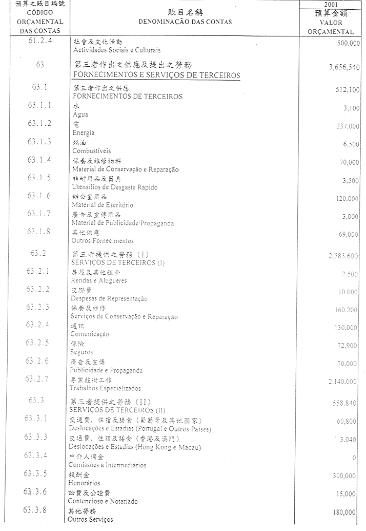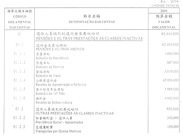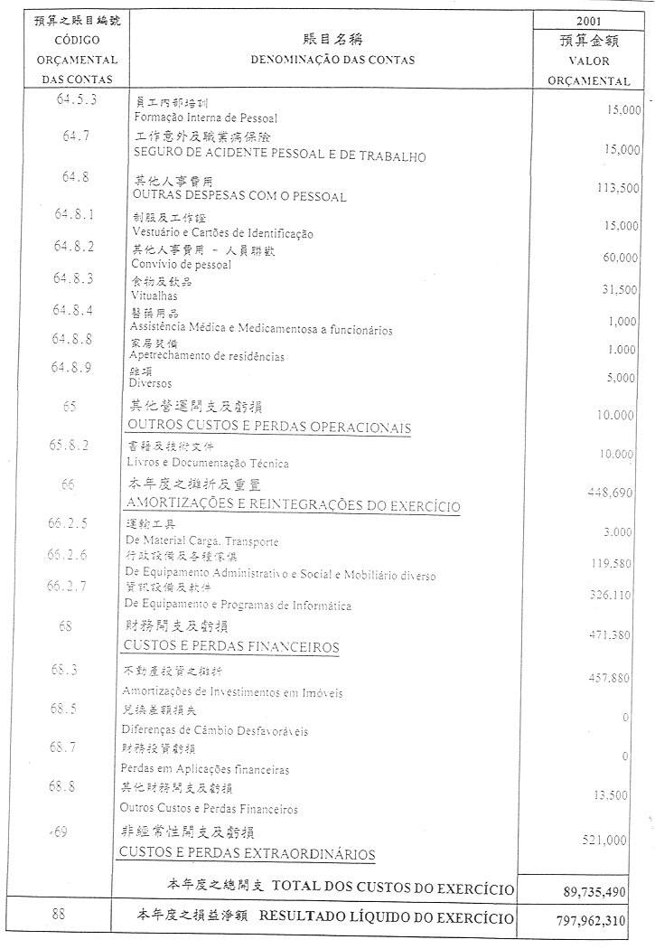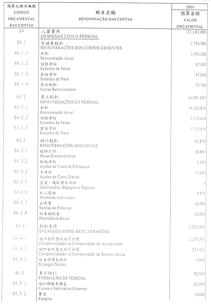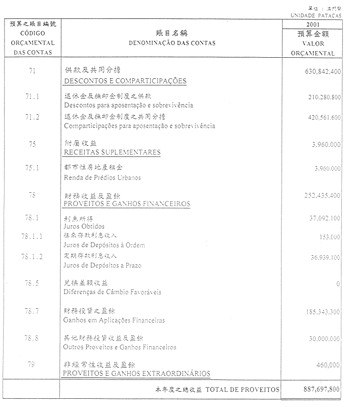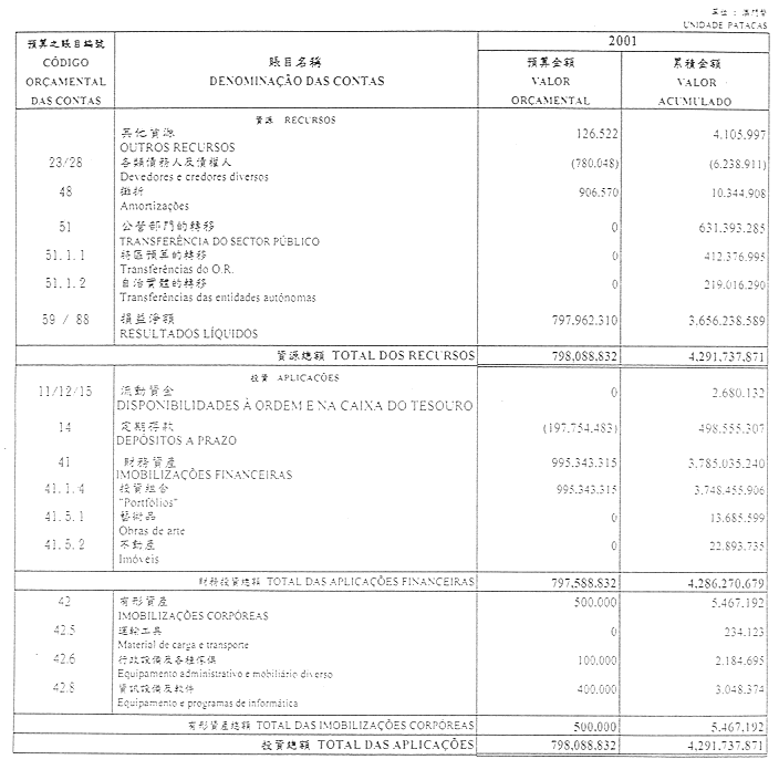 核准退休基金會二零零一年財政年度之本身預算,並於二零零一年一月一日起開始執行,預計收入及開支之金額分別為澳門幣887,697,800.00(捌億捌仟柒佰陸拾玖萬柒仟捌佰元整)及澳門幣89,735,490.00(捌仟玖佰柒拾