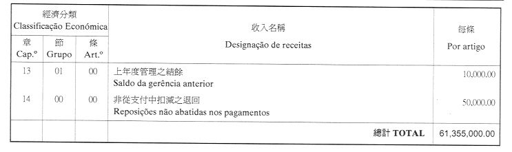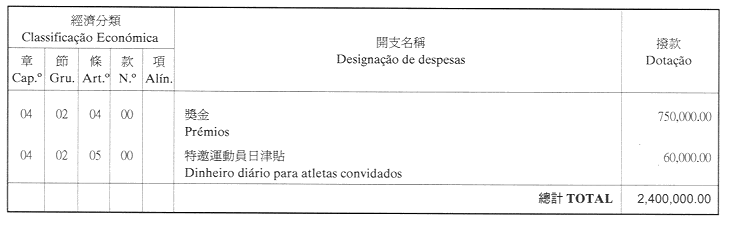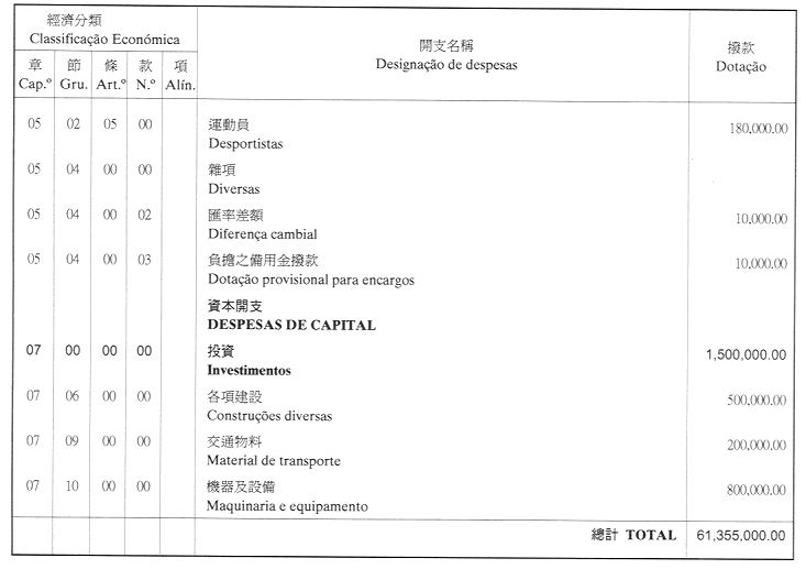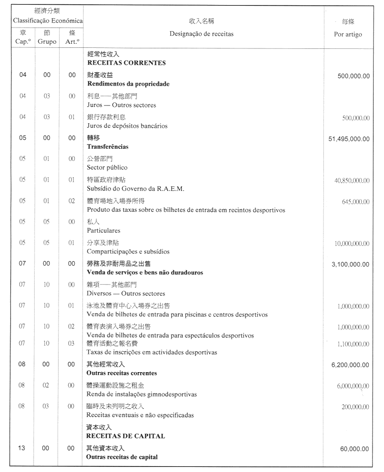 核准體育發展基金二零零一年財政年度之本身預算,並於二零零一年一月一日起開始執行,預計收入及開支之金額均為澳門幣61,355,000.00(陸仟壹佰叁拾伍萬伍仟元整),該預算為本批示之組成部分。