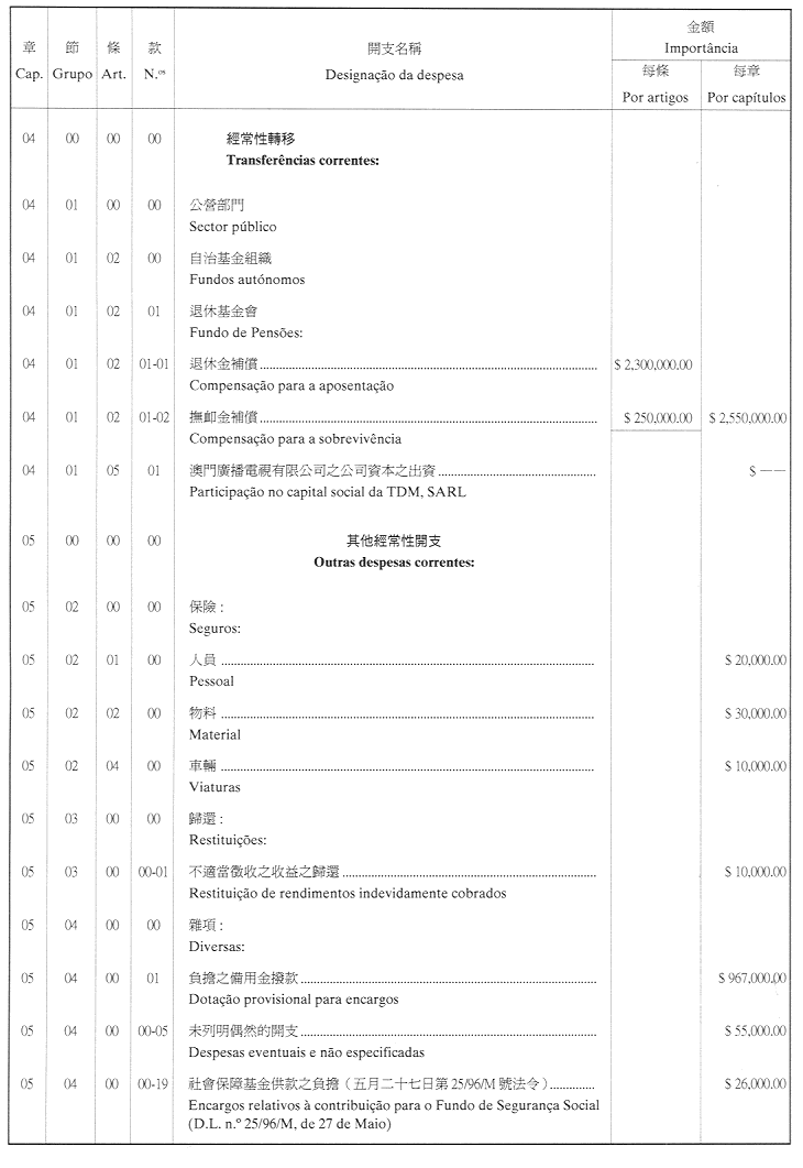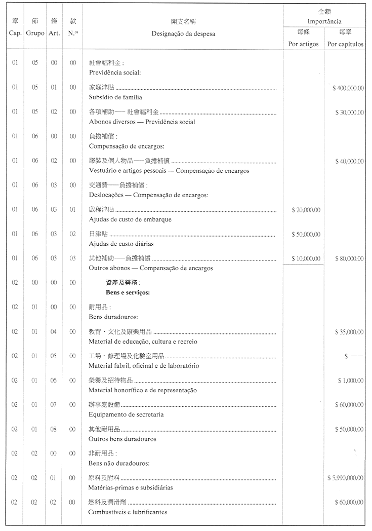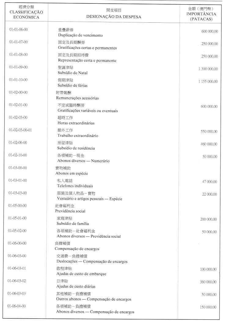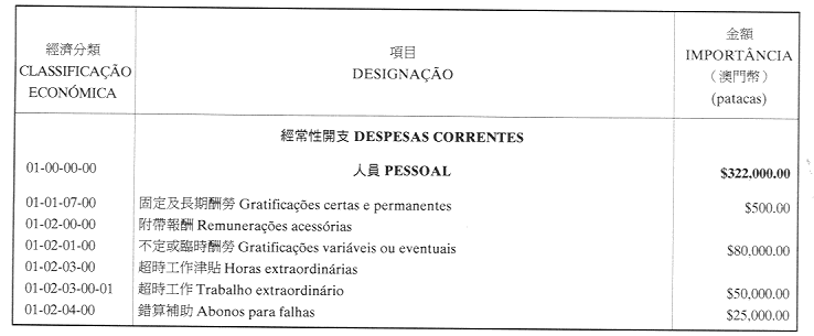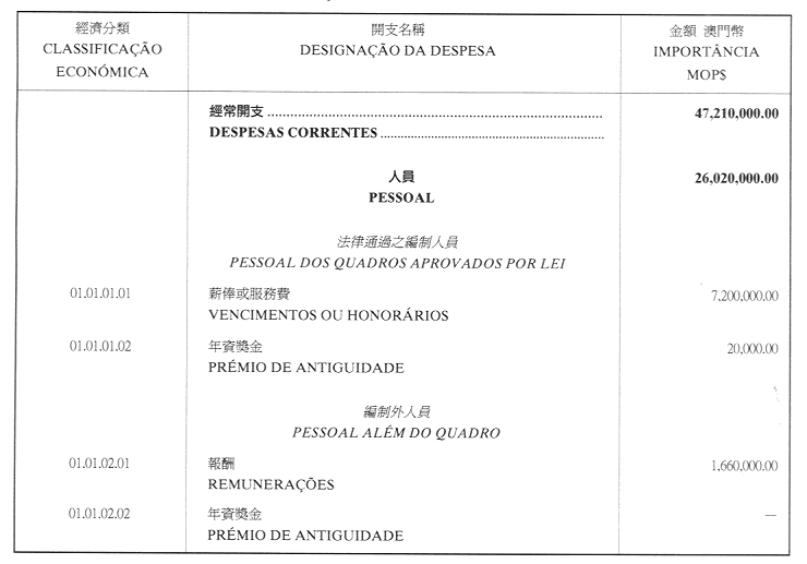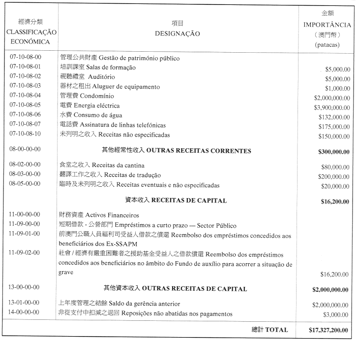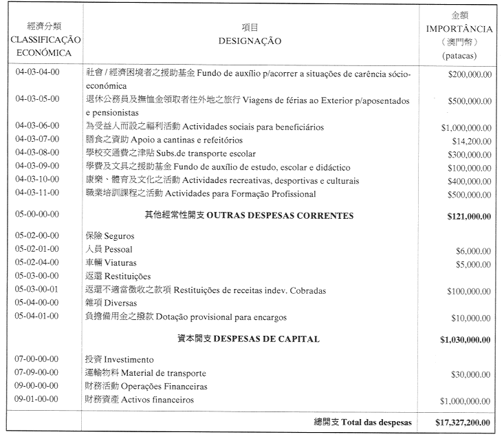 核准澳門公共行政福利基金二零零一年財政年度之本身預算,並由二零零一年一月一日起開始執行,預計收入及開支之金額均為澳門幣17,327,200.00圓(壹仟柒佰叁拾貳萬柒仟貳佰圓),該預算為本批示之組成部分。