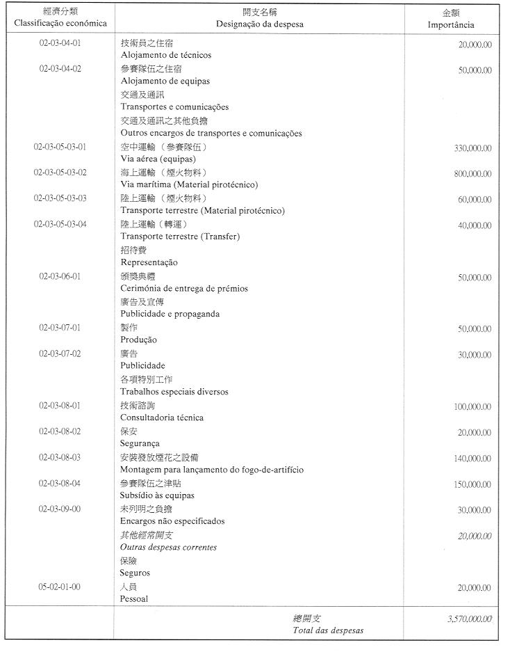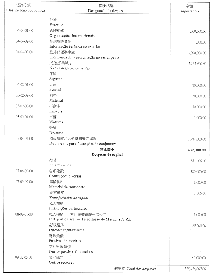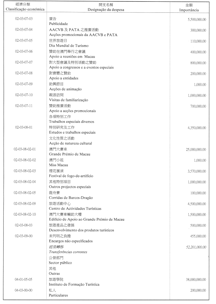 核准旅遊基金二零零一年財政年度之本身預算,並於二零零一年一月一日起開始執行,預計收入及開支之金額均為澳門幣148,054,000.00(壹億肆仟捌佰零伍萬肆仟元整),該預算為本批示之組成部份。