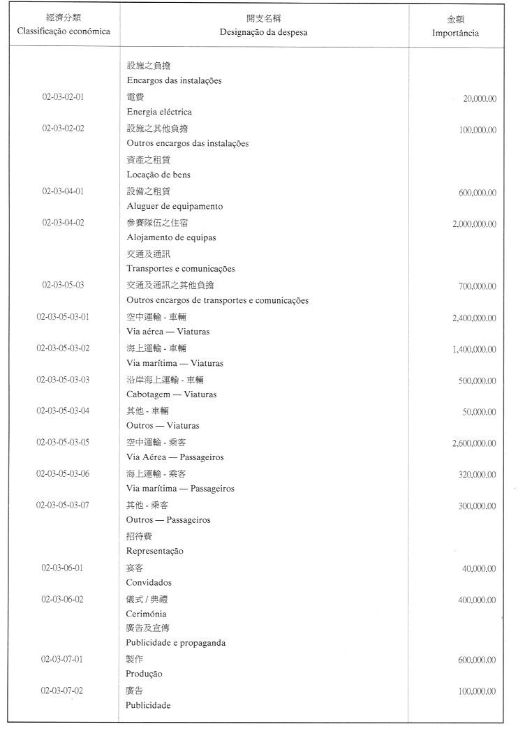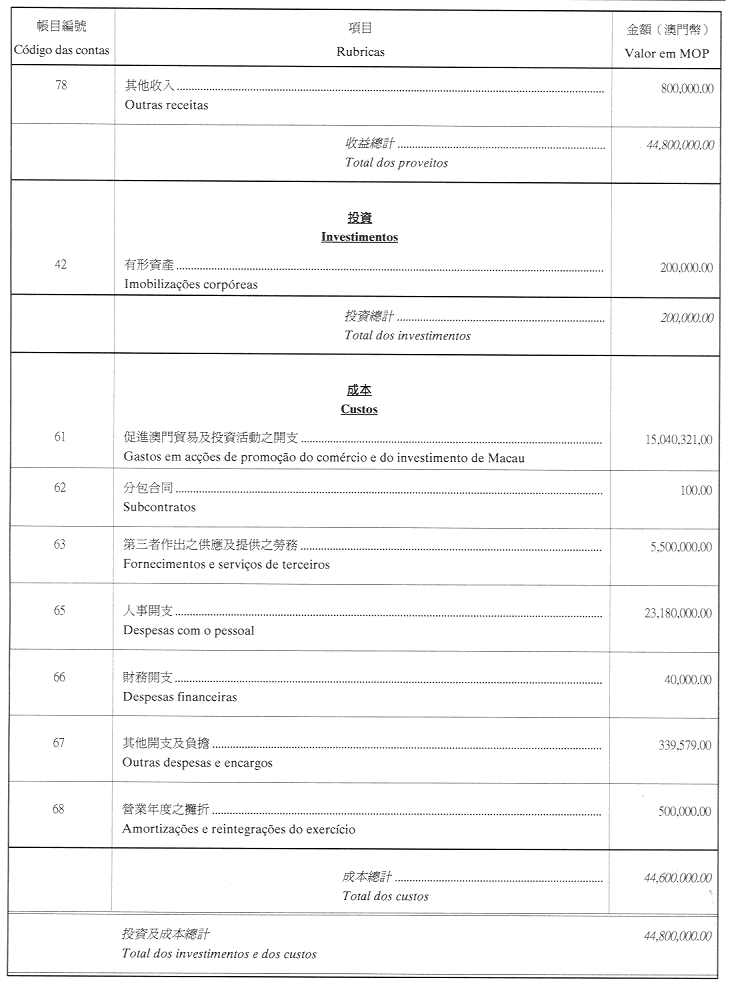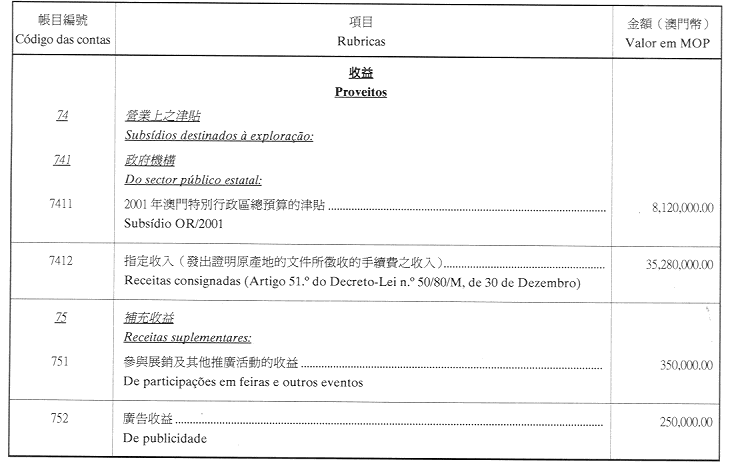 核准澳門貿易投資促進局二零零一年財政年度之本身預算,並於二零零一年一月一日起開始執行,預計收入及開支之金額均為澳門幣44,800,000.00(肆仟肆佰捌拾萬圓整),該預算為本批示之組成部份。