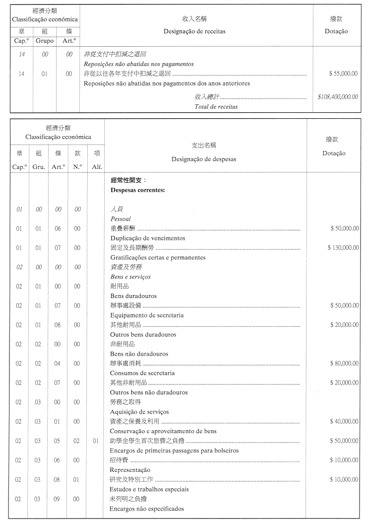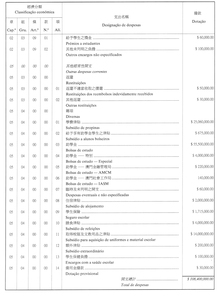 核准學生福利基金二零零二年財政年度之本身預算,並於二零零二年一月一日起開始執行,預計收入及開支之金額均為澳門幣108,400,000.00(壹億零捌佰肆拾萬元整),該預算為本批示之組成部分。