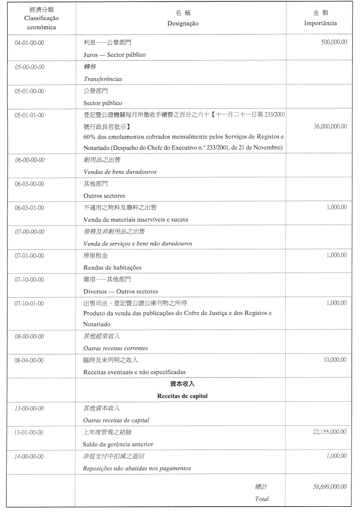 核准司法、登記暨公證公庫二零零二年財政年度之本身預算,並於二零零二年一月一日起開始執行,預計收入及開支之金額均為澳門幣58,699,000.00(伍仟捌佰陸拾玖萬玖仟圓整),該預算為本批示之組成部分。