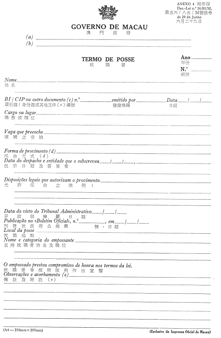 (一)本人 ............以本人名譽聲明並無出任澳門地區公共機關之任何職位或職務,且並無與任何法例有抵觸之情況。