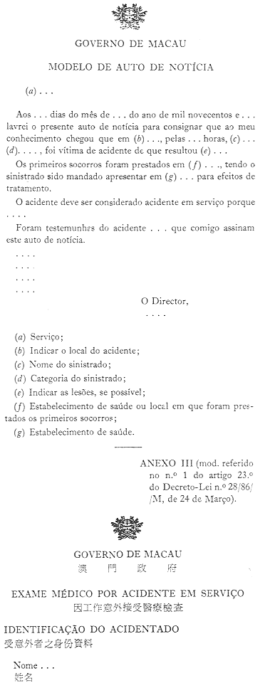 Os modelos dos impressos constantes dos anexos I e III do presente diploma constituem exclusivo da Imprensa Oficial de Macau.