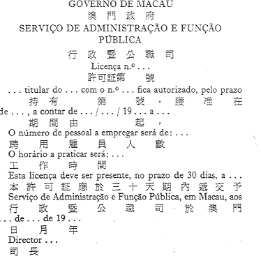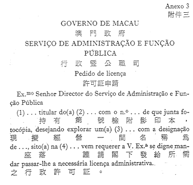 澳門地區社會經濟的發展以及各機關職權的逐步專門化,使一九六○年十二月三十一日第一四七五號立法條例所載的制度成為不合時宜,但行政暨公職司仍按照該法例的規定行使其在行政許可事宜方面的有關職權。
