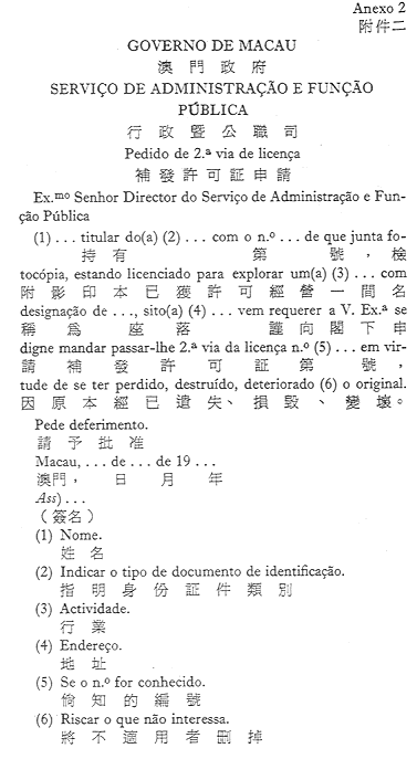 一、透過填寫本法令附件四格式及繳付相等於原有稅之一半稅款,行政暨公職司得批准關於已簽發許可證持有人更改之備註,但須對第十一條所訂條件予以證明。