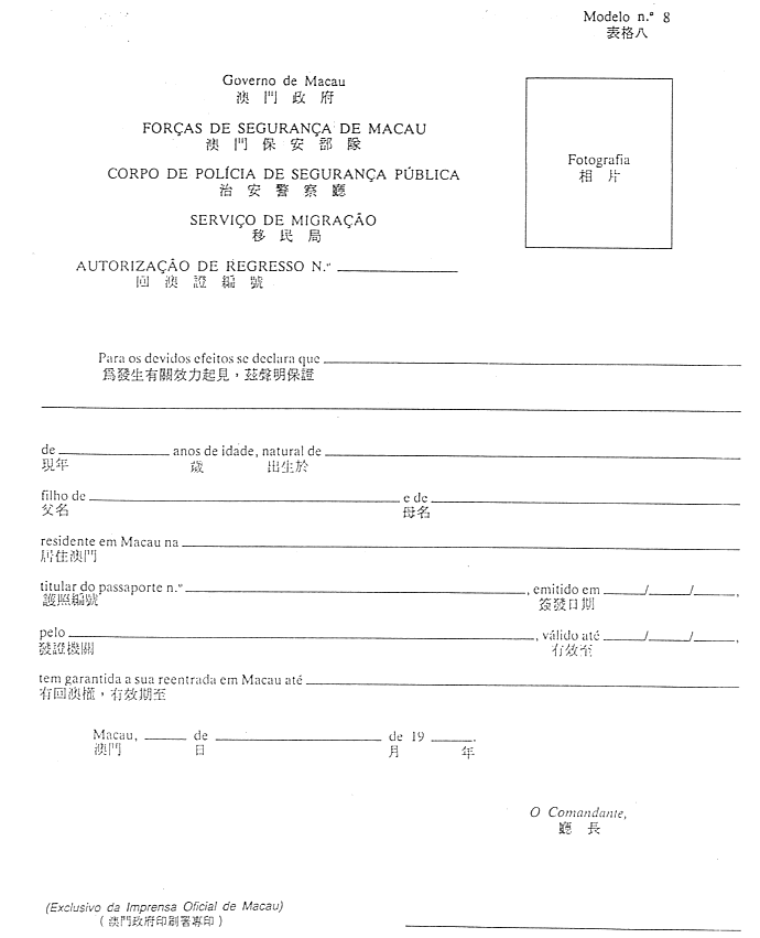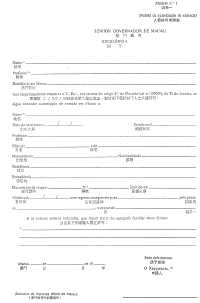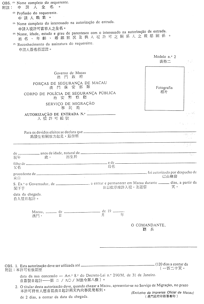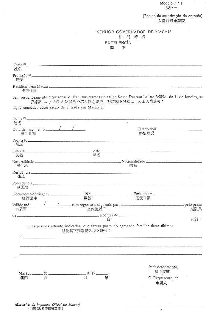 一、在不損害第九條規定之情況下,於無葡國外交或領事代表的國家或地區常住的人士之入境許可,應由當事人或其合法代表人填寫本法規附件之表格(表格一),透過治安警察廳移民局向澳門總督申請。