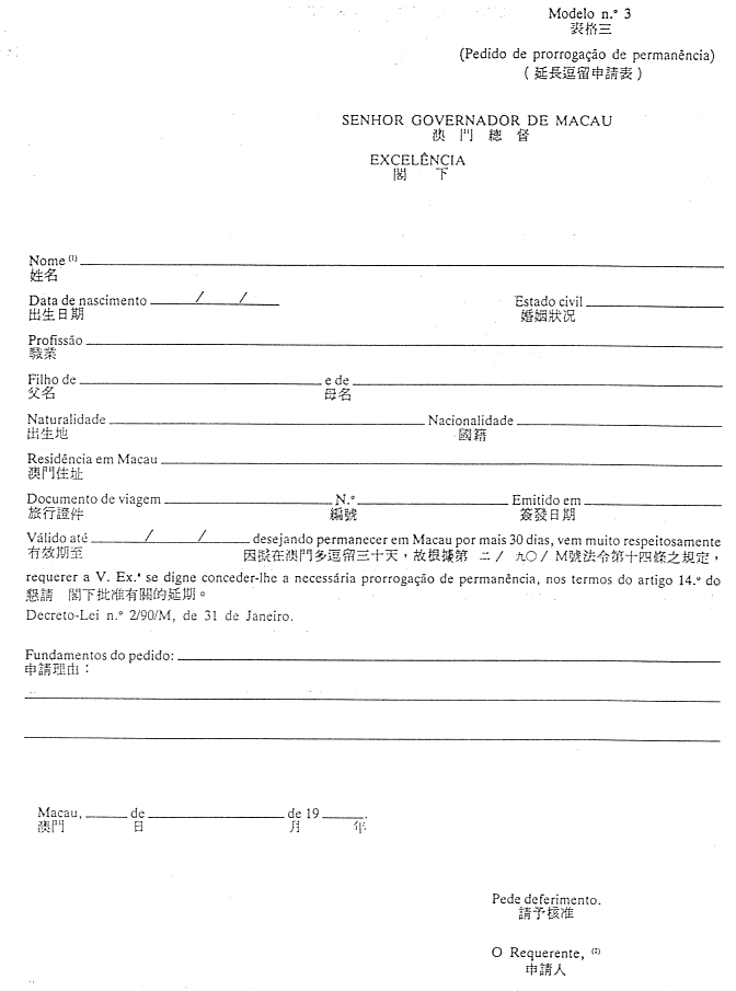 上條二款所指的延期,應在簽證或所給予逗留的期間告滿日十天前以本法規附件(表格三)向總督申請。
