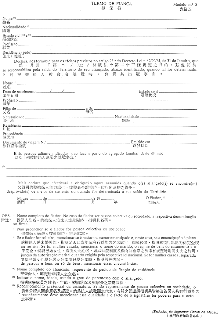 按照一九六九年七月五日第1796號立法條例所核准之章程獲准在澳門居留的人士,且曾按該立法條例之規定以現金作擔保者,得申請領回保證金,但必須不存在任何令其喪失之情況。