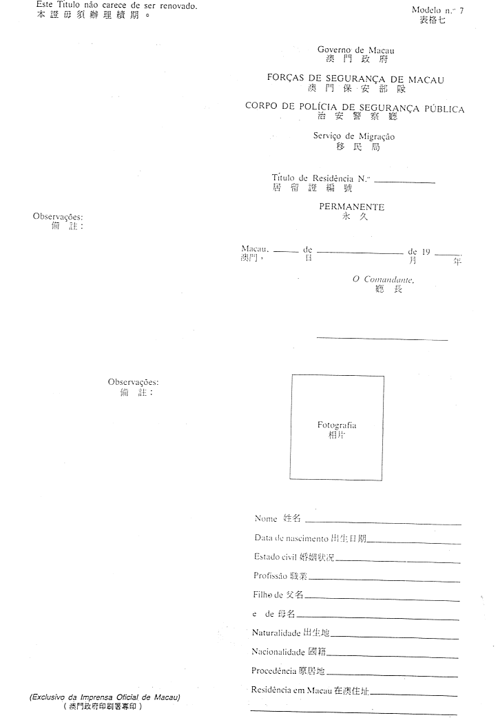 一、截至本法規公佈之日為止在澳門定居、且並無持有本地區有關機關所簽發身份證明文件之香港身份證、香港永久性居民身份證或回港證之持有人,應在本法規生效之日起計兩個月內申領居留證。