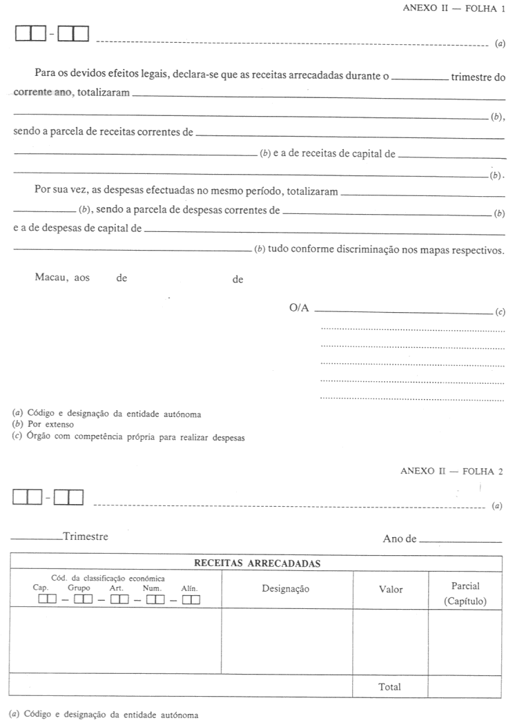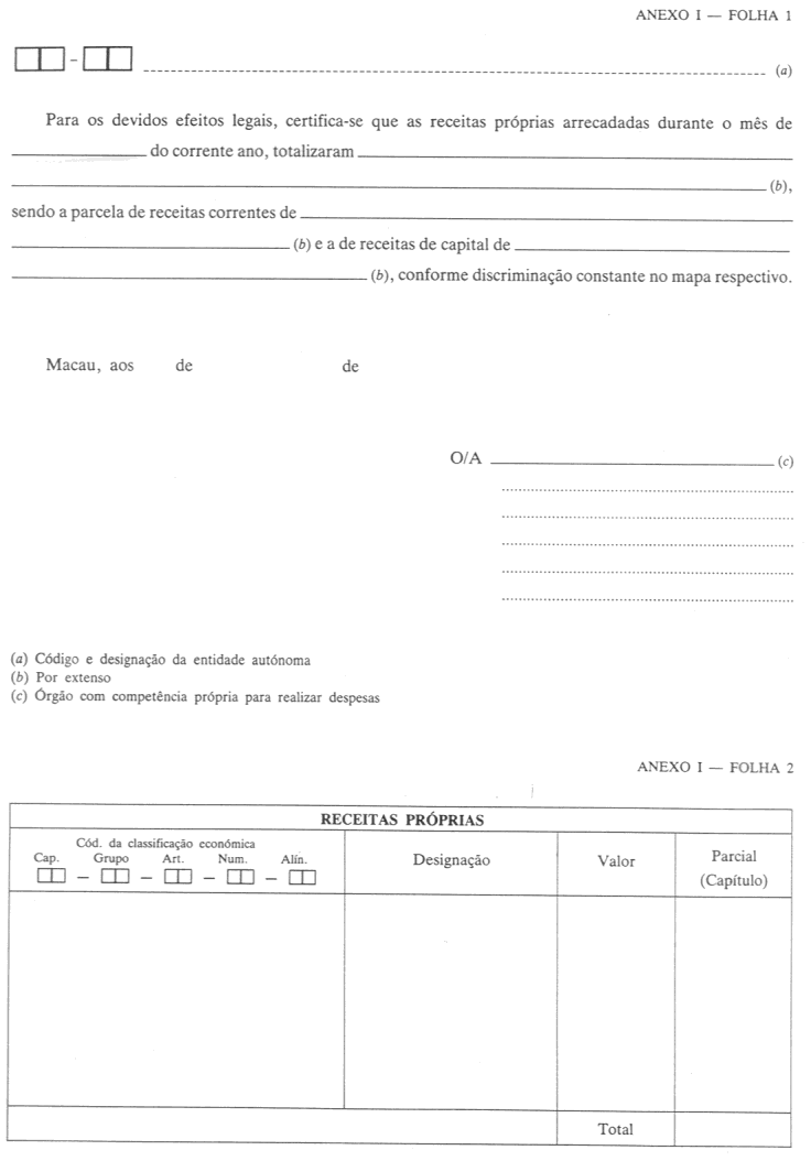 1. Os modelos das certidões e mapas a que se referem os artigos 9.º e 12.º do Decreto-Lei n.º 42/88/M, de 30 de Maio, com a redacção que lhe foi dada pelo Decreto-Lei n.º 15/91/M, de 25 de Fevereiro, são os constantes dos anexos I e II ao presente despacho e que dele fazem parte integrante.
