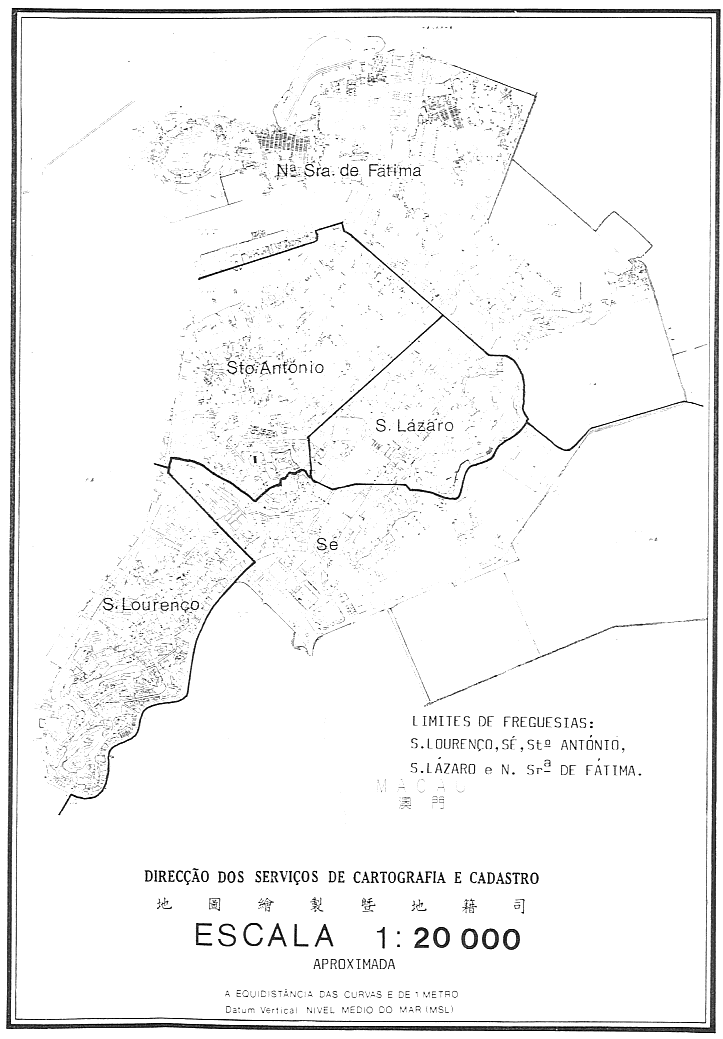 e)花地瑪堂區——包括澳門半島的北部及西北部,以在沙梨頭南塢的一條計劃闢設的街道為界,其坐向乃根據坐標點(M為20123公尺,P為19447公尺)及(M為20314公尺;P為19524公尺)而定,於上述末後的坐標點向北折轉,並進入和樂大馬路延伸至與一條根據坐標點(M = 20457公尺;P = 19611公尺)及(M = 20579公尺;P = 19646公尺)而定的計劃闢設的行人道的交界處,及至與白朗古將軍大馬路的交界處,並沿該馬路、美副將大馬路、海邊馬路(直至進入澳門自來水公司水塘的西南斜坡為止)、上述的斜坡及一段友誼大馬路的中心延伸至外港澳門自來水公司水塘的彎角處止。
