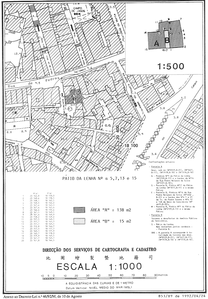 Em virtude de pretender fazer o aproveitamento global do terreno, sito no Pátio da Lenha, n.os 5, 7, 13 e 15, descritos sob os n.os 8 129 a fls. 152 v. do livro B-25, 3 427 a fls. 158 v. do livro B-17, 3 578 a fls. 61 v. do livro B-18 e 3 576 a fls. 59 v. do livro B-18, os titulares do domínio útil do mesmo requereram autorização para modificar o seu aproveitamento conjuntamente com uma parcela com a área de 15 m2, propriedade do Território, identificada pela letra «B» na planta n.º 853/89, emitida em 24 de Abril de 1992, pela Direcção dos Serviços de Cartografia e Cadastro, com vista à sua anexação ao terreno confinante concedido por aforamento aos requerentes.